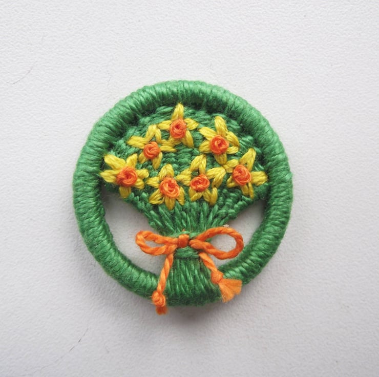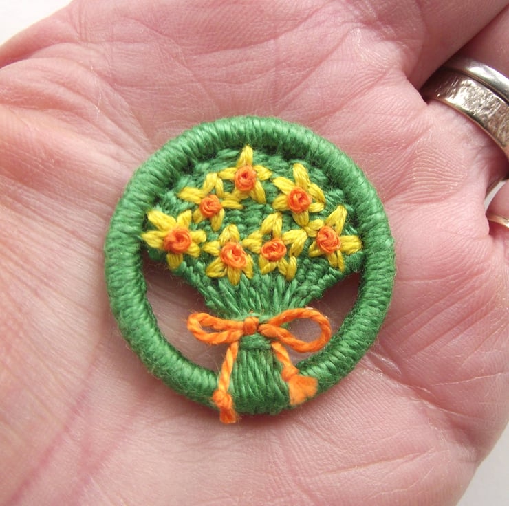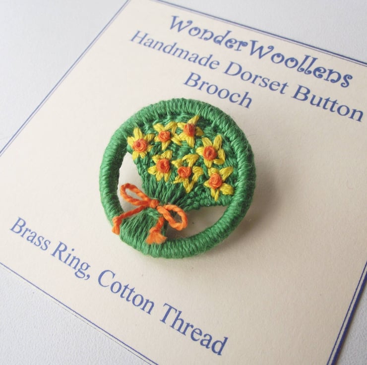 I made this brooch using traditional Dorset button techniques, of working cotton thread on a brass ring, forming a bouquet of daffodil flowers, tied with an orange bow, within a green ring.