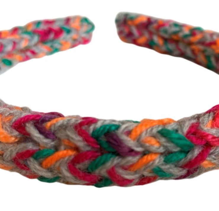 Knitted with specially curated colours of leftover acrylic yarn, set on a plastic Alice headband skeleton rescued from a commercially purchased headband where the cover has been damaged / split. The headband has no teeth. The knit grips the hair without snagging and the light flexibility of the headband skeleton frame helps grip the head gently.