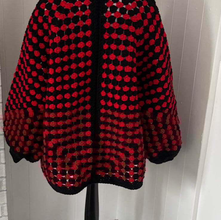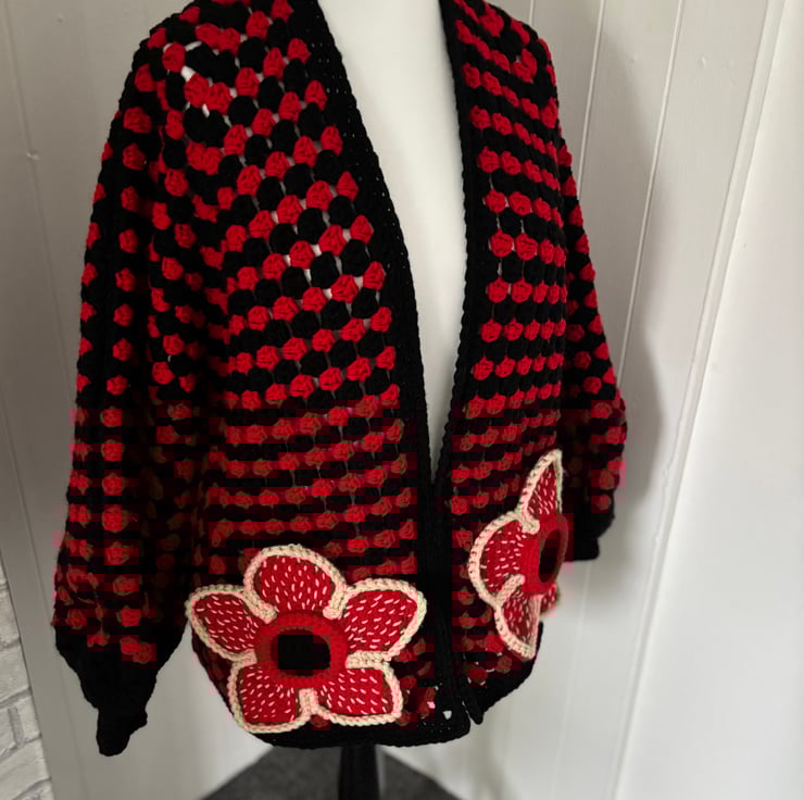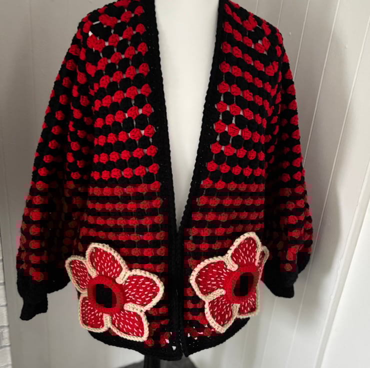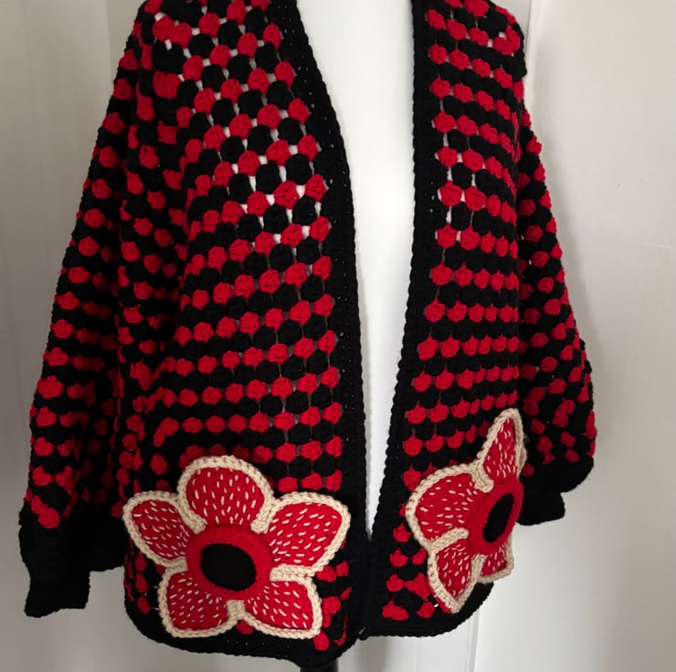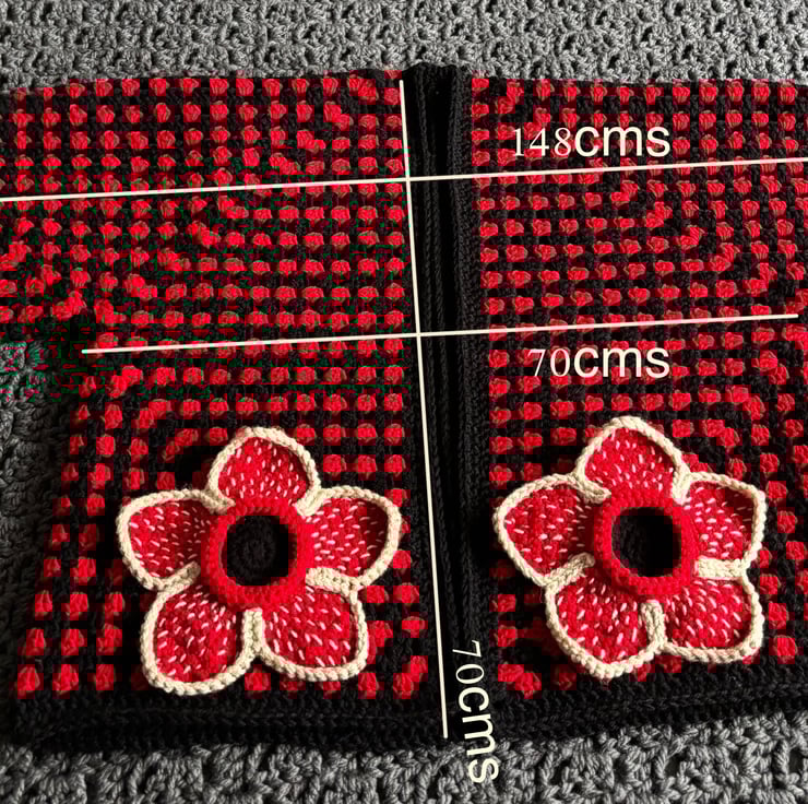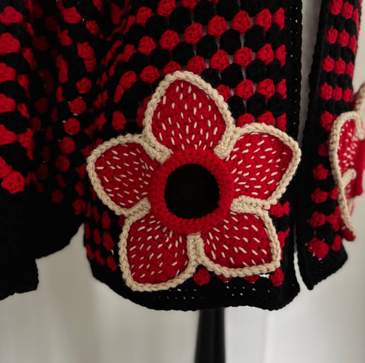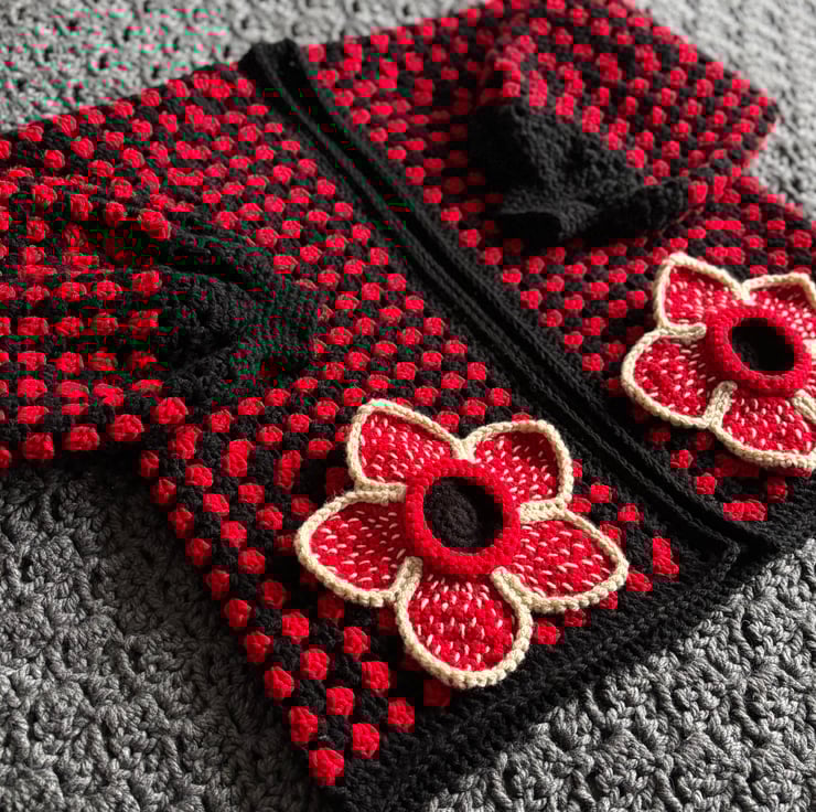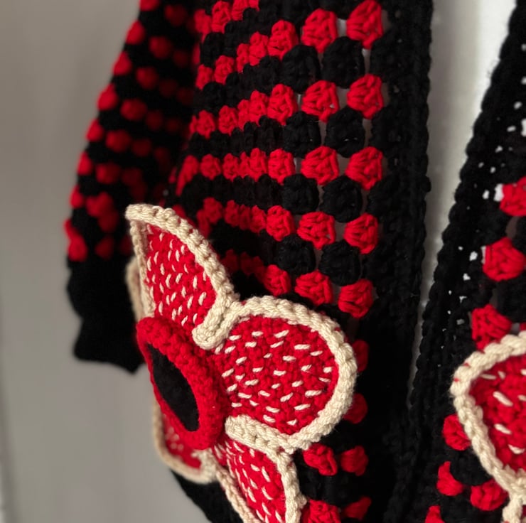 Made using red heart yarn in red and love crafts paintbox yarns in black and beige
