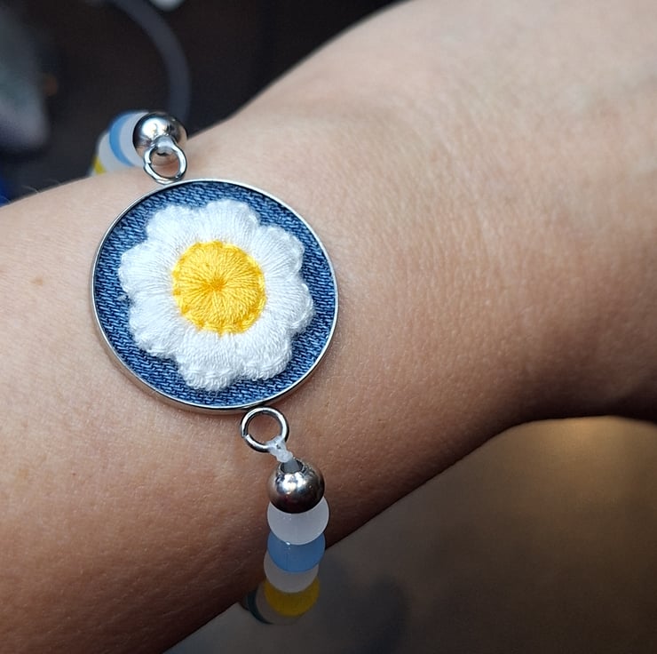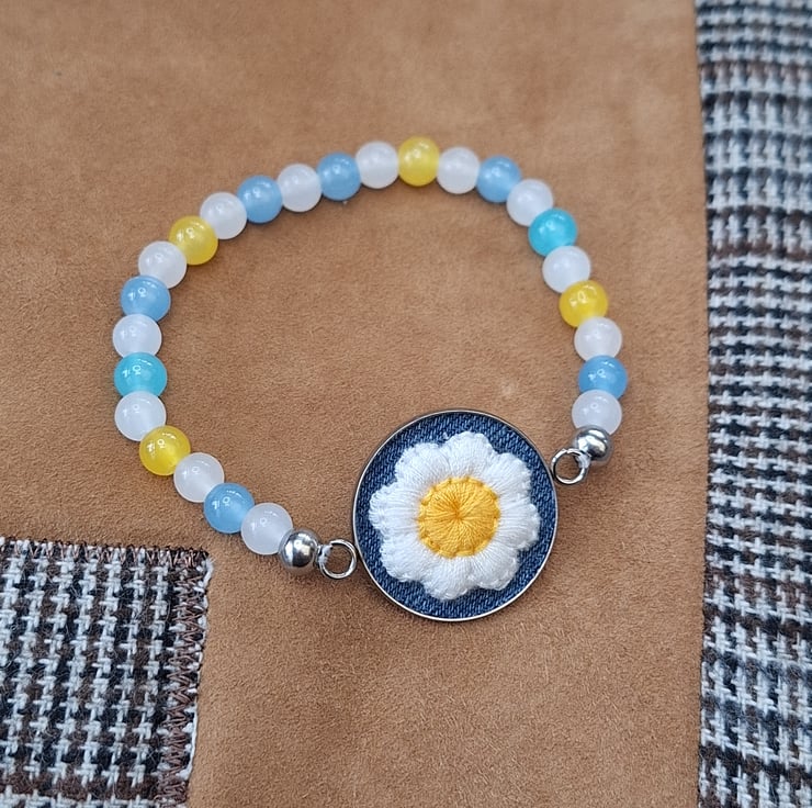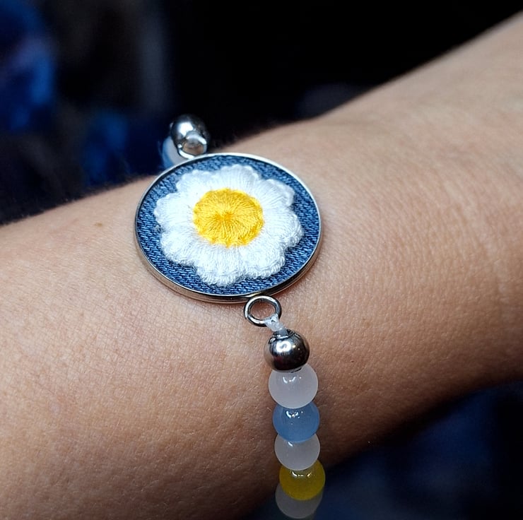 A cheerful floral bracelet featuring a traditional white and yellow crochet daisy appliqué, fitted onto reclaimed blue denim and framed in a 25mm stainless steel bezel.