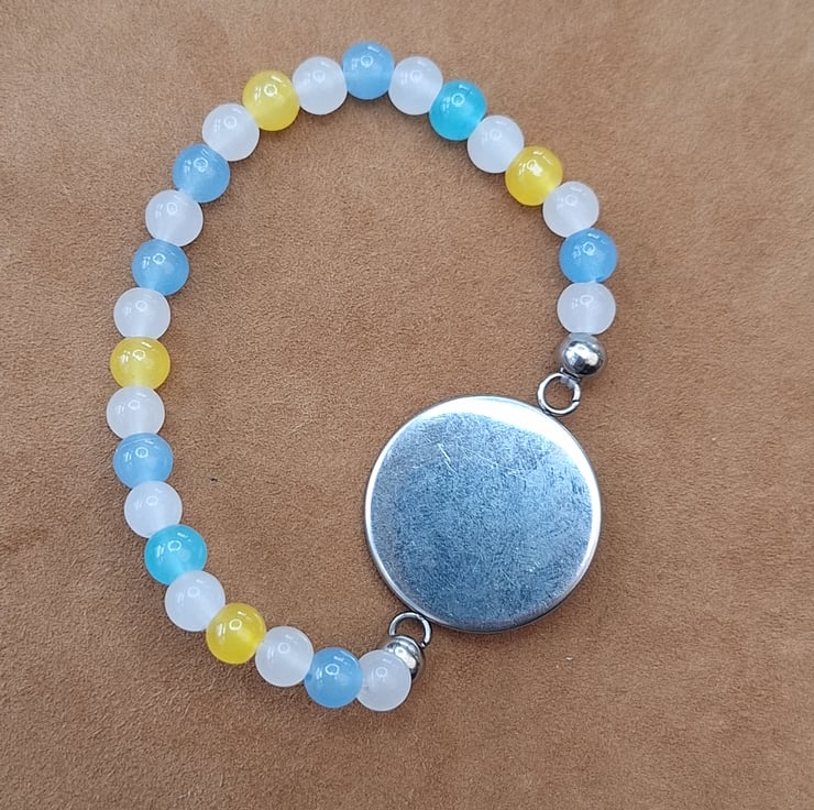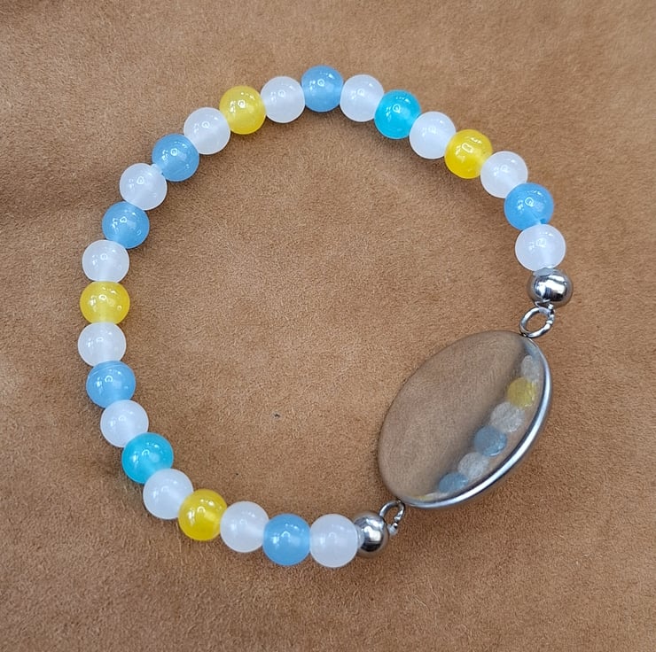 This piece is strung on a stretchy elastic band with 6mm glass and stainless steel beads in soft sky tones — white, blue, and golden yellow.