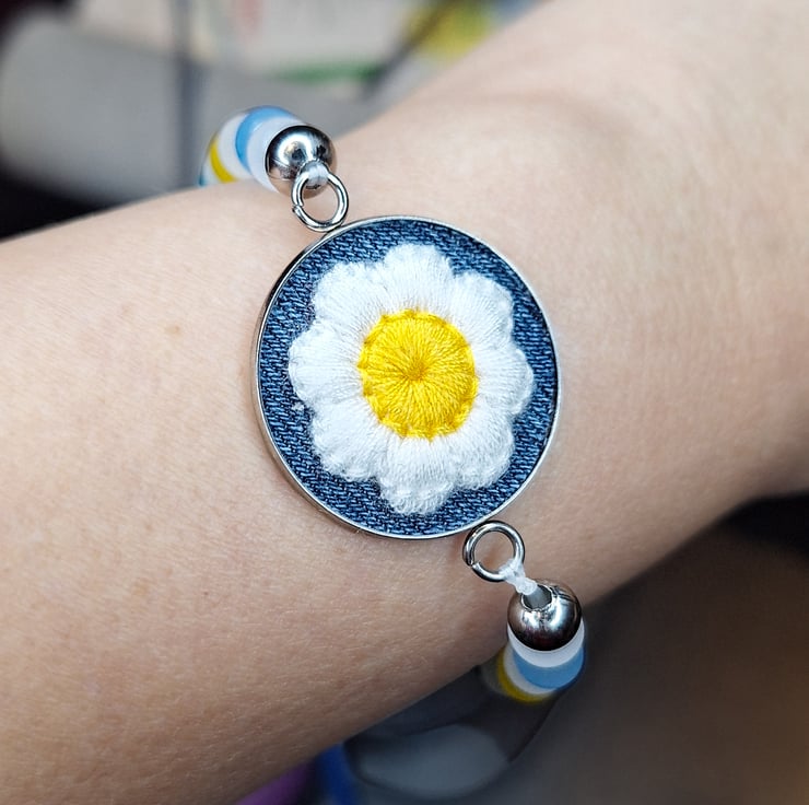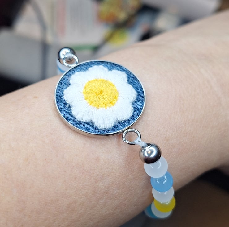 Fun Boho Beaded Bracelet – with White & Sunshine Daisy Bezel (Reclaimed Denim)