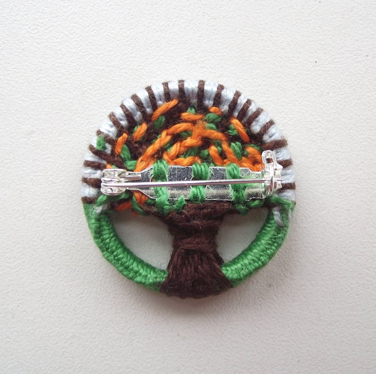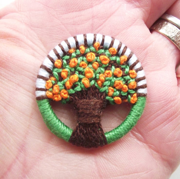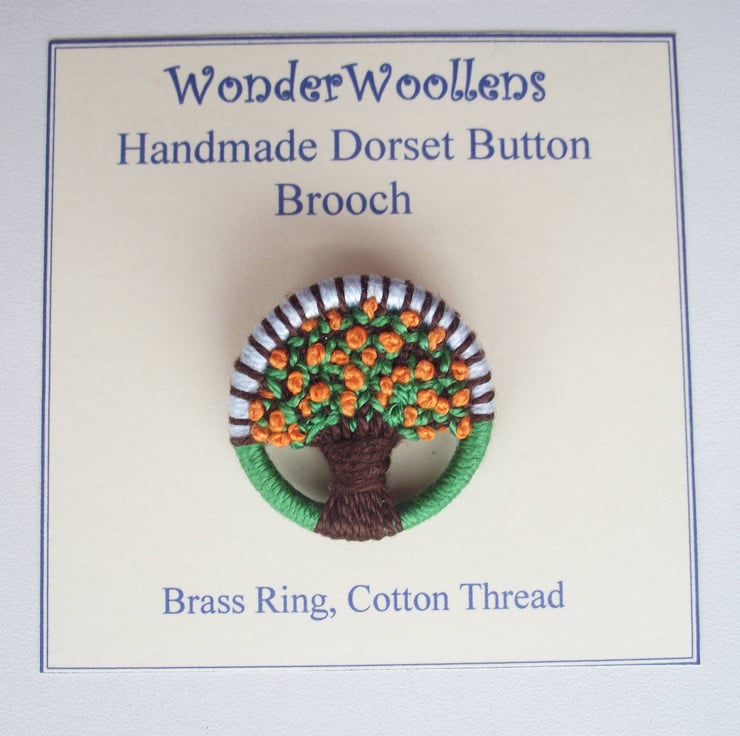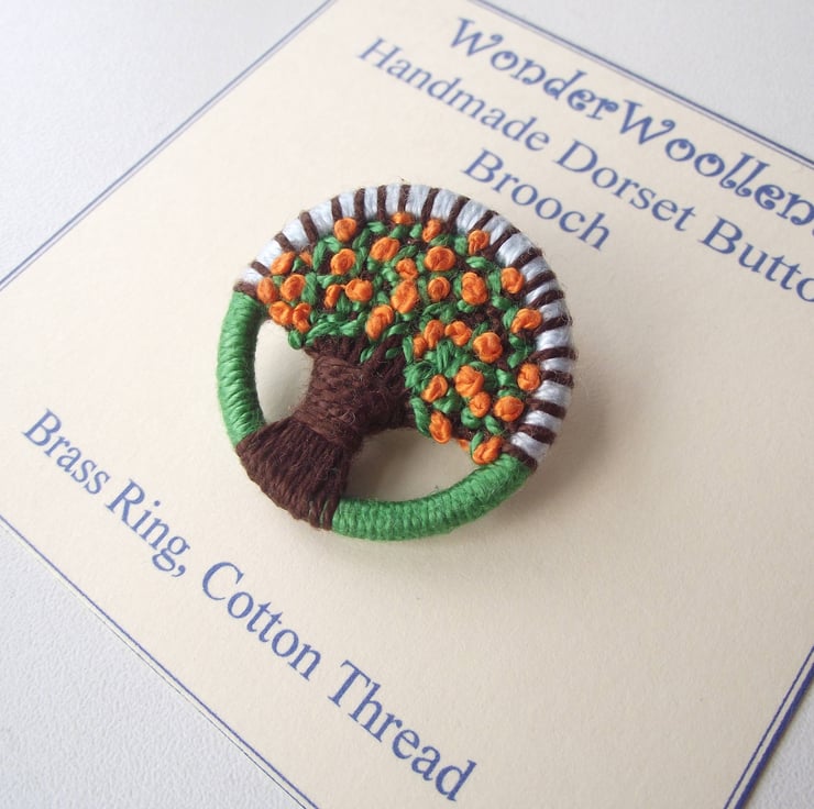 I made this orange tree brooch using traditional Dorset button techniques, of working cotton thread on a brass ring, forming an orange tree with a brown trunk, green leaves and French knot oranges. The tree is set against a pale blue sky and green grass foreground.