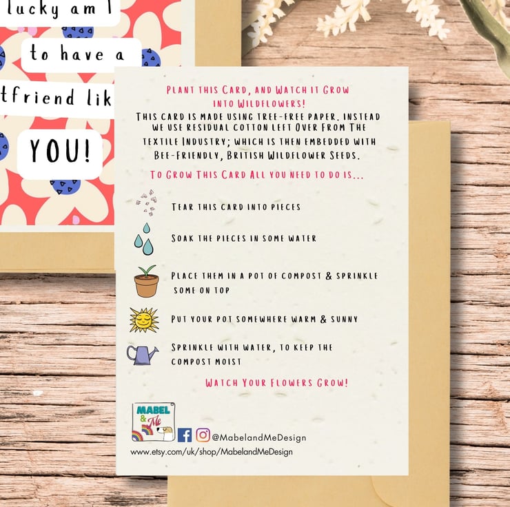 OR BRAND NEW to Mabel & Me this card is available on 100% Recycled Aged White Card and comes with a plantable envelope. This means the recipient can keep hold of their beautiful card, and still be able to grow flowers by planting the envelope! Clever Eh?? We thought so.