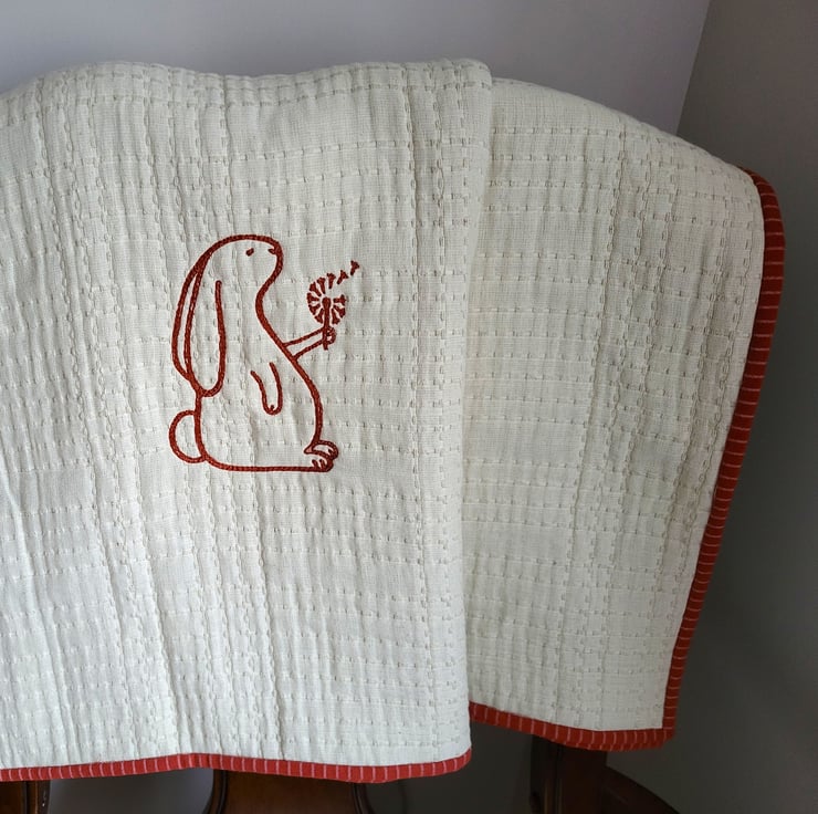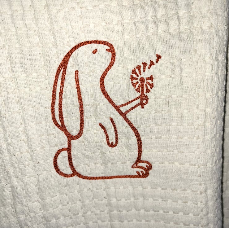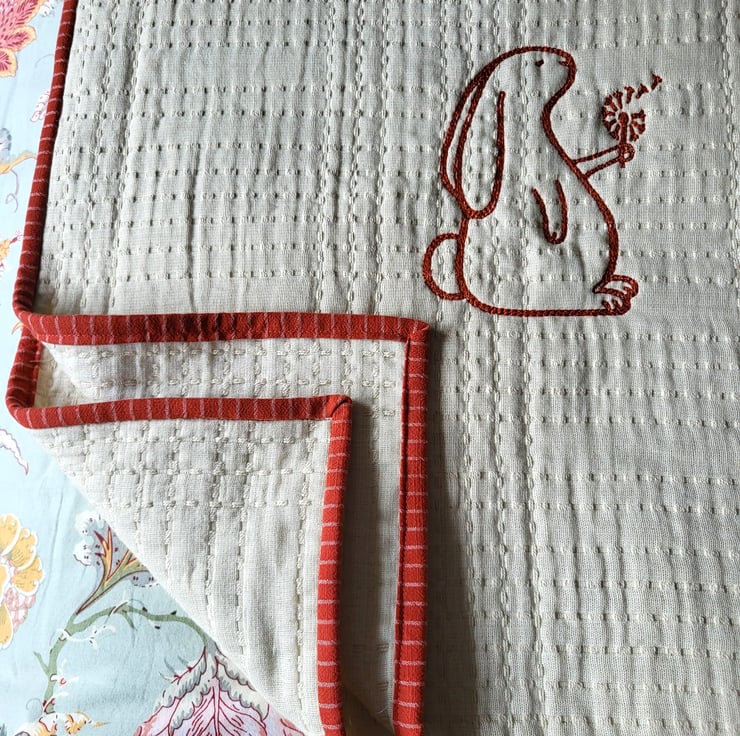 A beautifully handcrafted cot blanket made from natural fibres, featuring an elegant embroidered rabbit with delicate dandelion flower detailing. Soft, timeless, and lovingly made, this blanket is designed to be cherished for years to come.