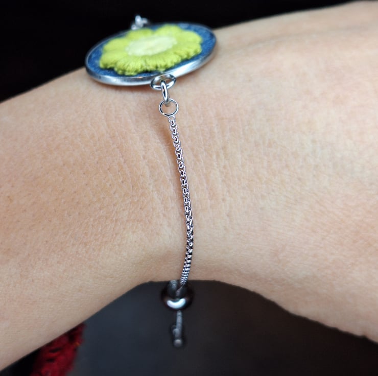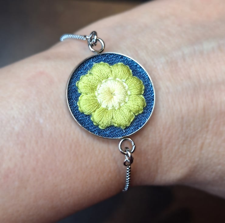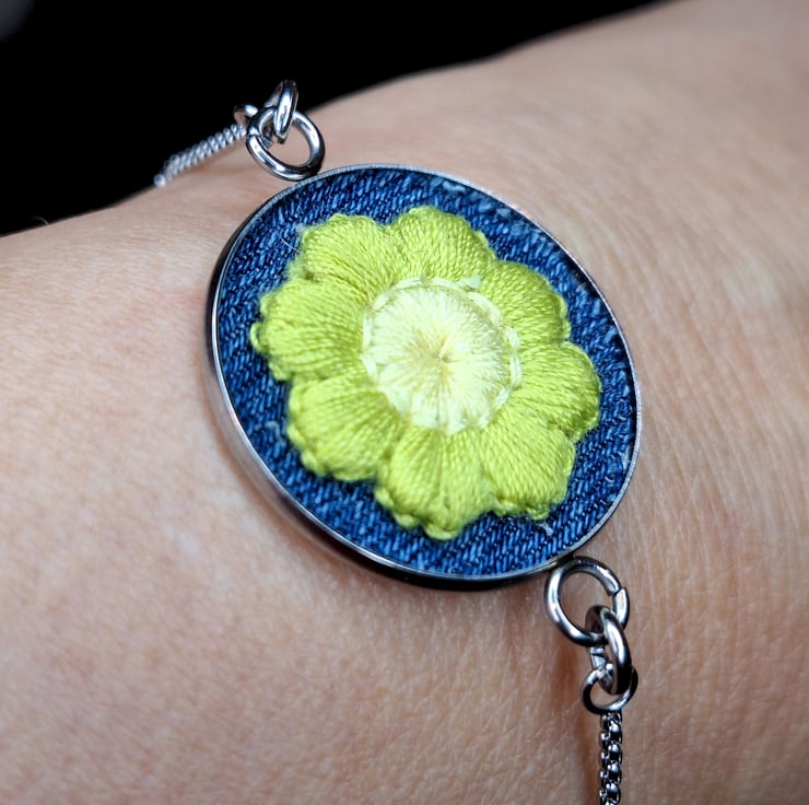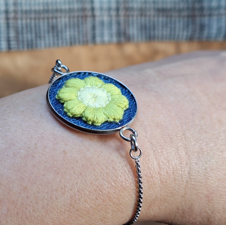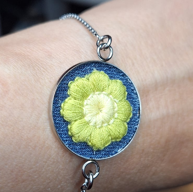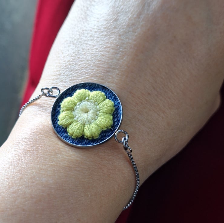 A charming floral bracelet featuring a crochet daisy appliqué with soft olive green petals and a creamy white centre, fitted onto reclaimed blue denim and framed in a 25mm stainless steel bezel. The pendant is fitted to a delicate silver chain with a smooth ball-end slider, making it fully adjustable and easy to wear.
