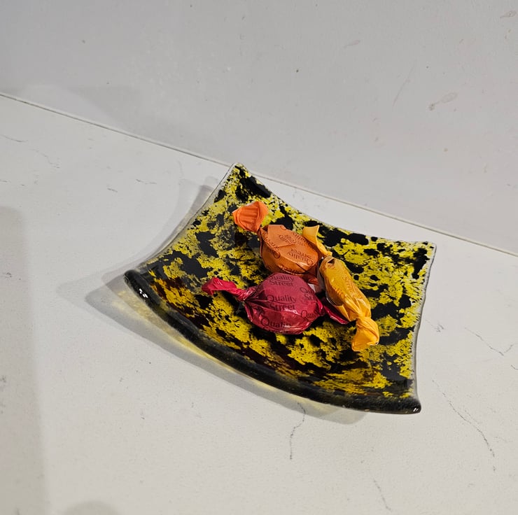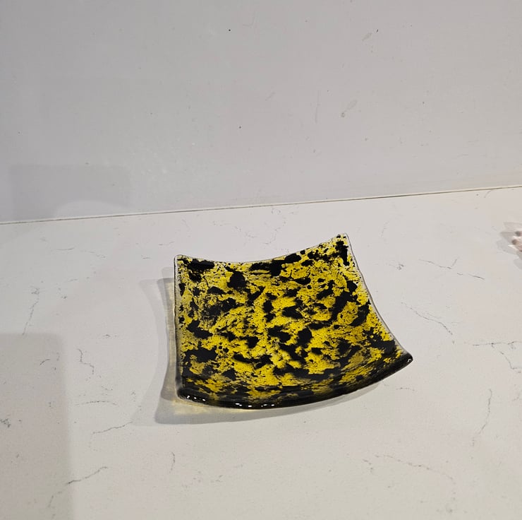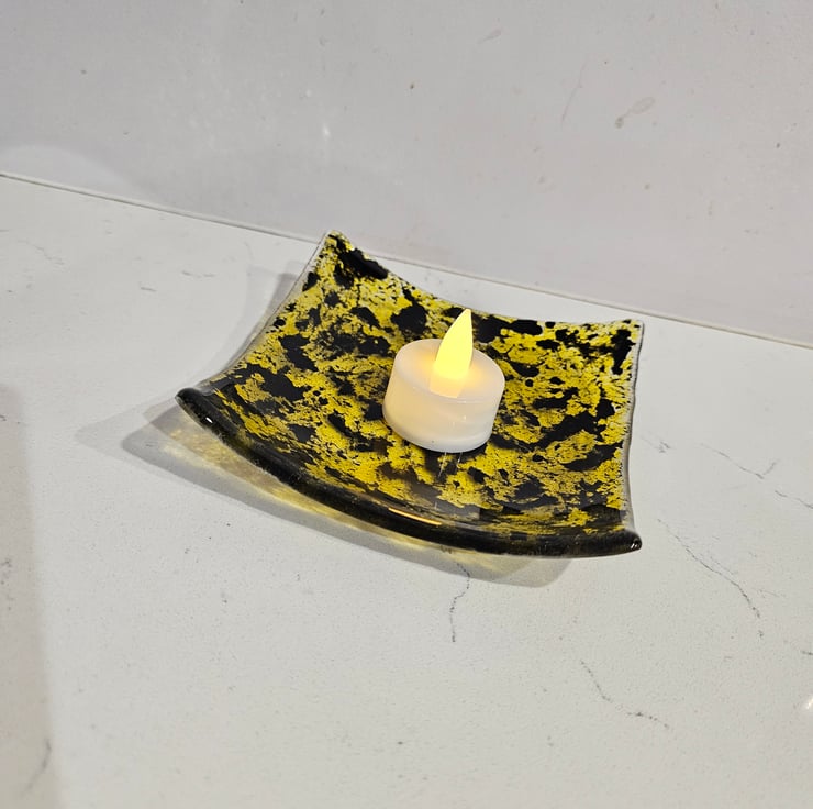 A unique decorative square bowl. For gifting or beautiful to keep or yourself. Also practical can be used as a candle base / jewellery holder / Soap dish and many other uses .This is food safe. Hand cut and kiln fused, a unique item. . Approximately 12.5cm/5" square. Please note outer packaging may be recycled.