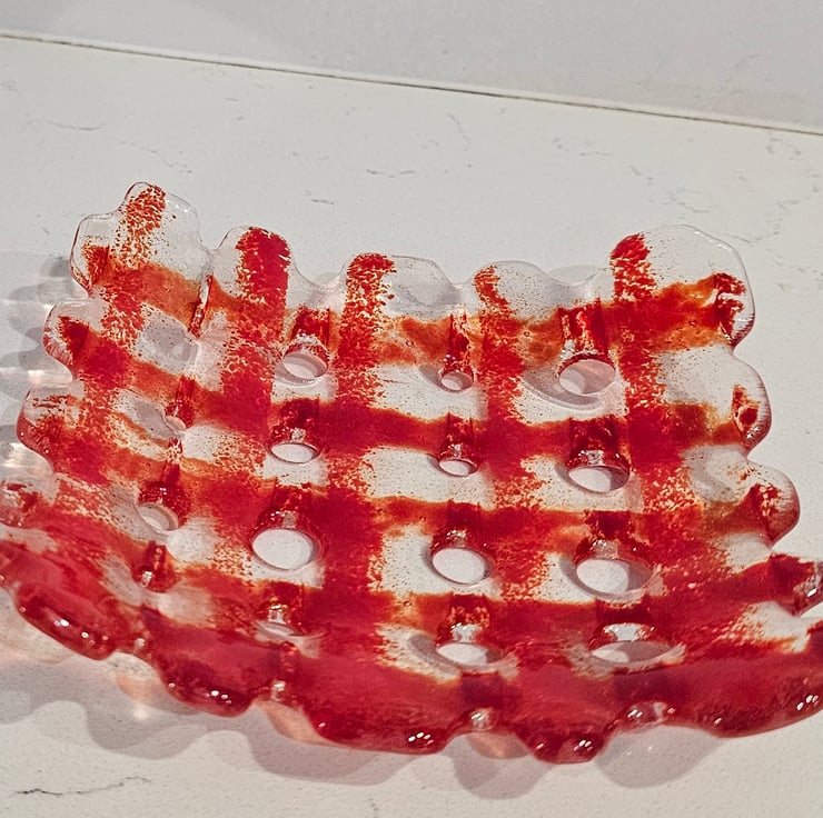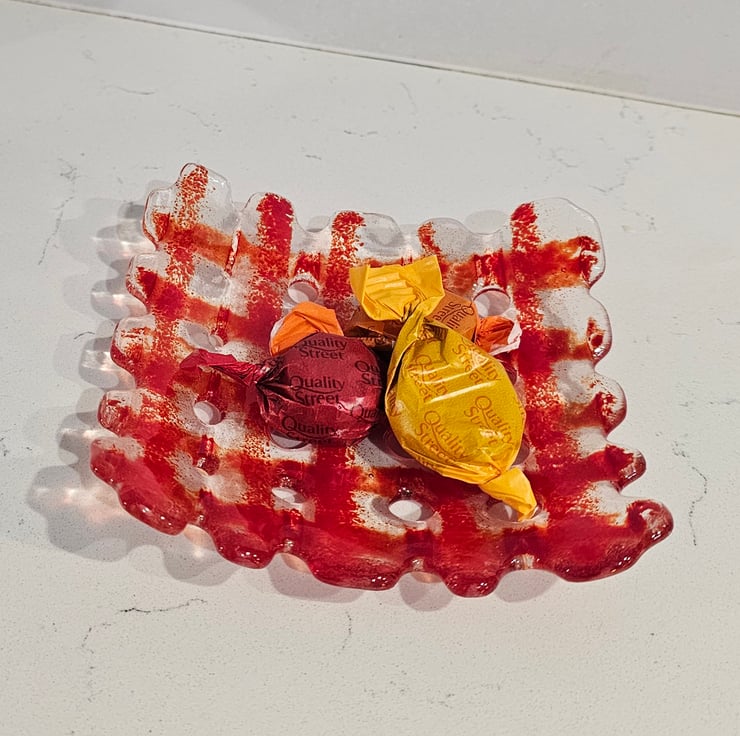 Fused Glass small  square decorative bowl - red grid