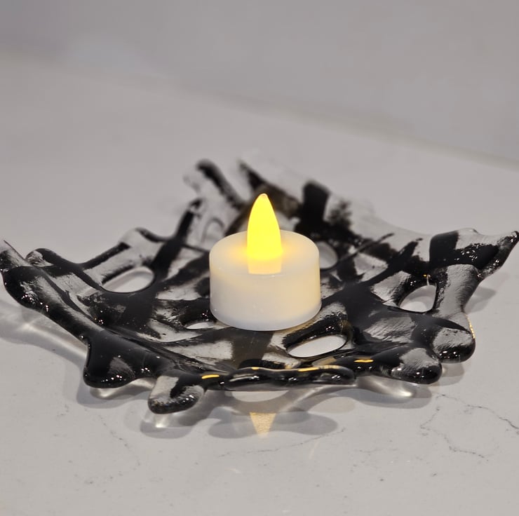 A unique decorative square bowl. For gifting or beautiful to keep or yourself. Also practical can be used as a candle base / jewellery holder / Soap dish and many other uses .Hand cut and kiln fused, a unique item. . Approximately 12.5cm/5" square. Please note outer packaging may be recycled.