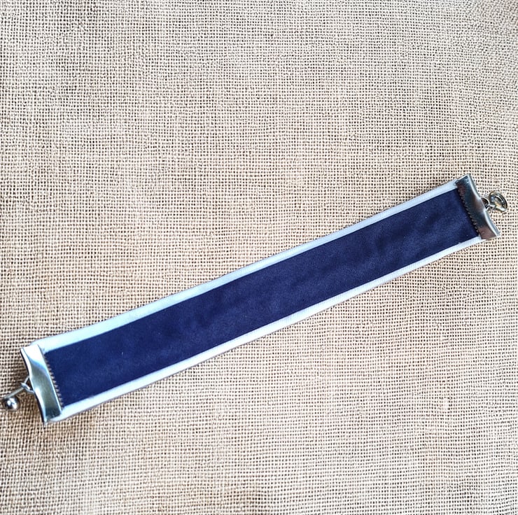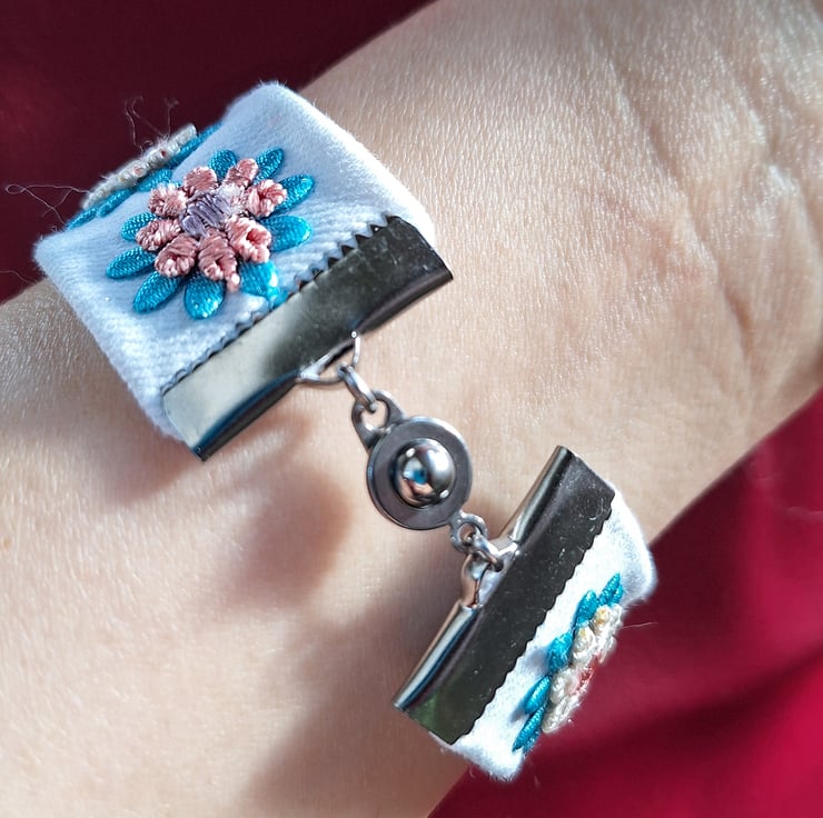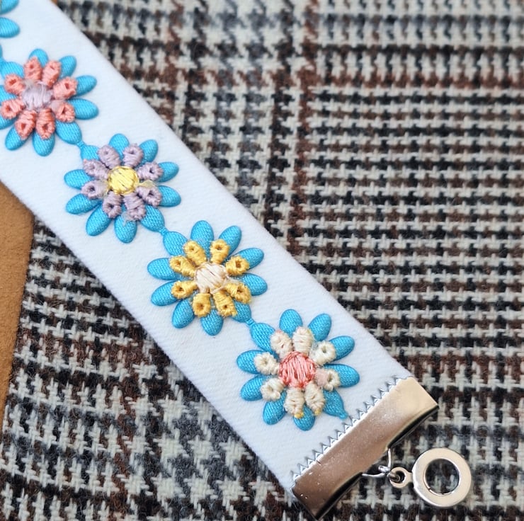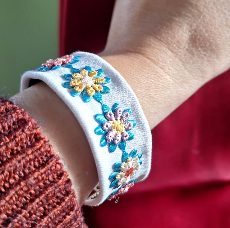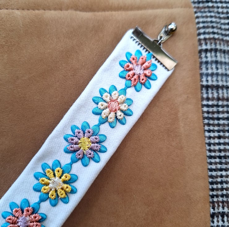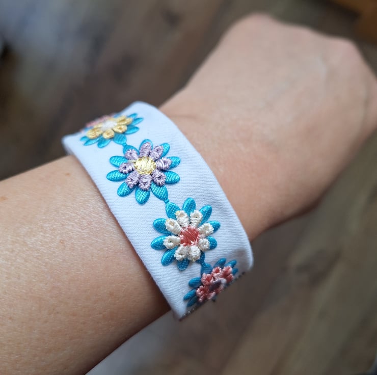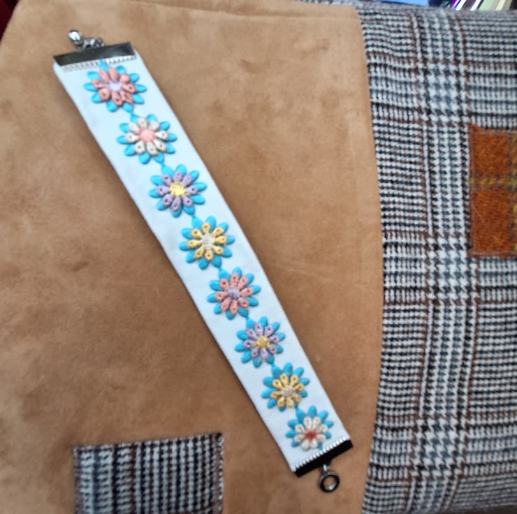 A crisp white denim cuff bracelet featuring shimmering lace appliqué in soft spring colours — pink, purple, yellow, and cream — set against rich sky blue. The double floral motif glistens beautifully, catching the light with every movement. Fitted with stainless steel ribbon edge and easy-release clasp, this bracelet is stylish, comfortable, and full of handmade charm.
