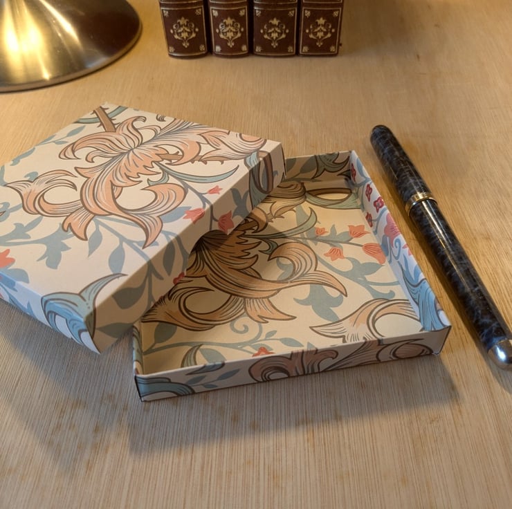 This range of ultra-thin boxes was created following requests from customers for a box that could be sent via the Letter post. Previous individual gift boxes had to be posted to customers via expensive parcel post making the purchase price too high. These thin gift boxes are designed to be sent via Royal Mail Large Letter post, reducing the cost of sending them to customers and also the price customers would pay for sending them on with gifts for friends and relatives. They are, of course still a beautiful option for gifts to be given by hand.