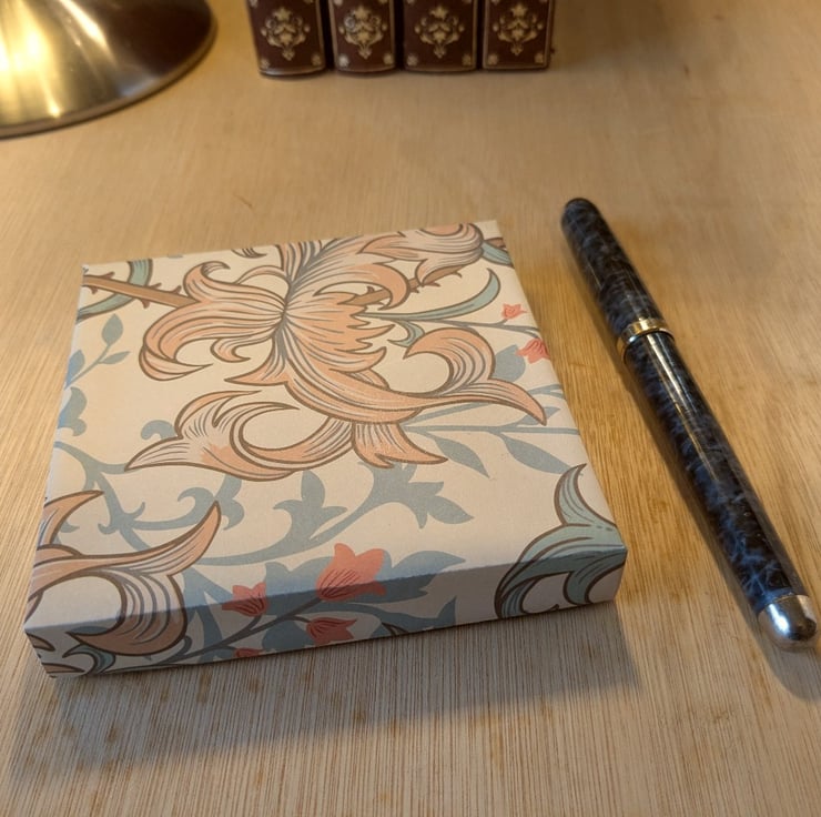 The box is complete and ready to use, requiring no further assembly, and the paper completely covers the exterior and interior of both the lid and the base with no cardboard showing. It measures 10.6cm square closed. Outside height is 1.7cm and internal box depth is 1.5cm. Ideal for all items not requiring a deep box, such as delicate jewellery pieces, silk scarves, embroidered handkerchiefs, etc.