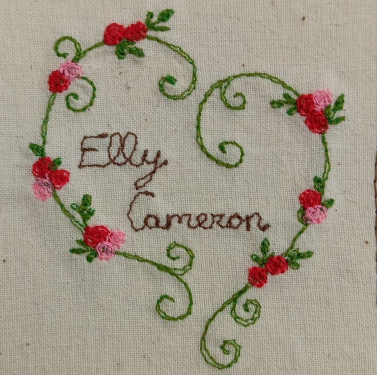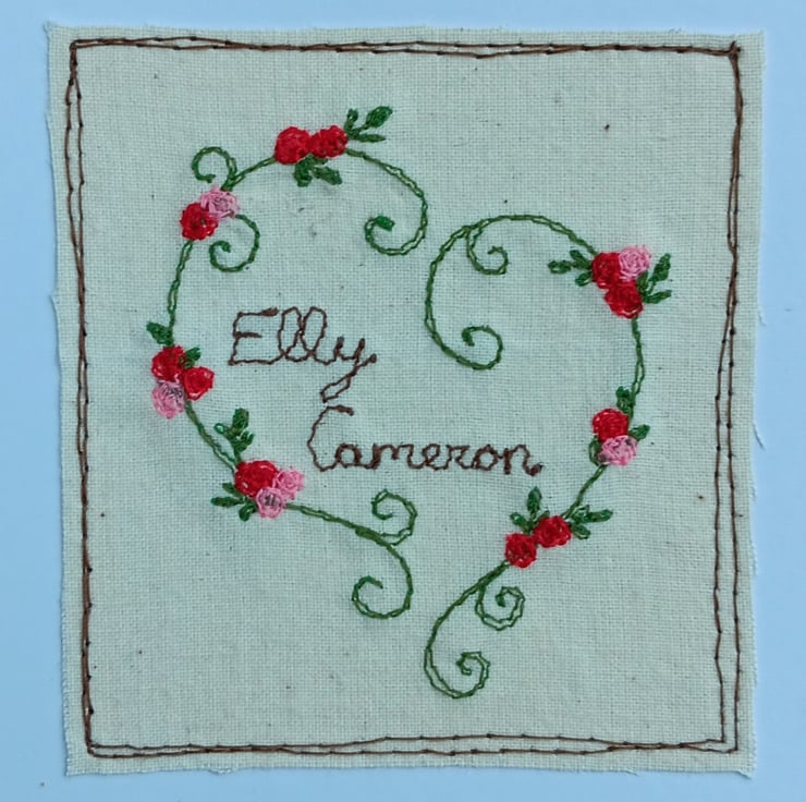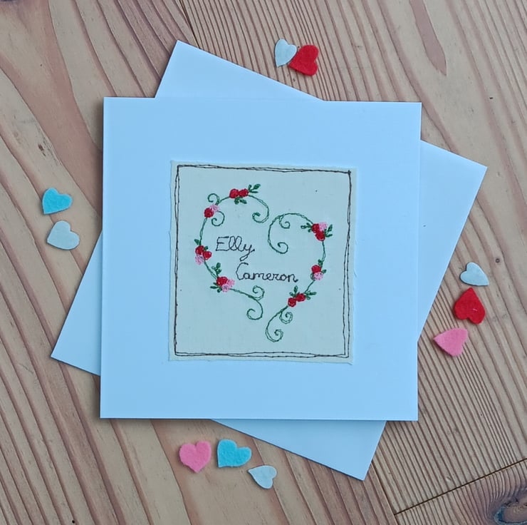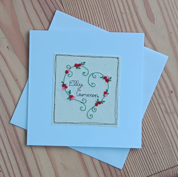 The design depicts a heart shape embroidered onto fabric using free motion embroidery. Leaves and pink and red roses are added to make it almost like a botanical wreath. Your names are embroidered inside the heart, making this a perfect card for Valentine's Day, but also ideal to celebrate an engagement or wedding. Please state which names you would like added at checkout.