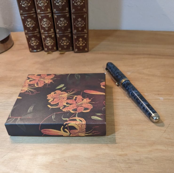 An ultra-thin, handmade gift box with separate lid based on the Natural History Museum 'Dark Florals' series of beautiful decorative papers, entitled 'Honeysuckle'.