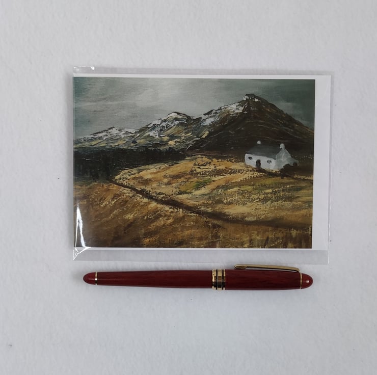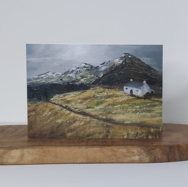 Inspired by a trip to Eryri, Snowdonia the original painting from which this card was printed depicts where I image I would love to live. The landscape reflects that of the area with the leaden sky above threatening snow, the little cottage appeared in that spot only in my head but fits perfectly.