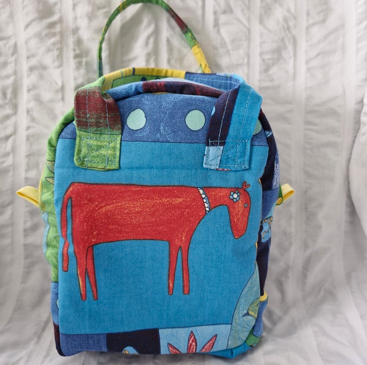 Child size zipped cool bag or lunch bag with insulated facing and animal print