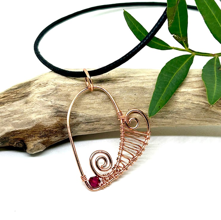 An elegant, handmade copper heart pendant necklace, lovingly crafted using wire-wrapping and wire-weaving techniques. Formed from tarnish-resistant copper wire, this asymmetric heart is beautifully detailed with delicate swirls and an intricate woven design, and finished with a striking red crystal bead for a subtle pop of colour.