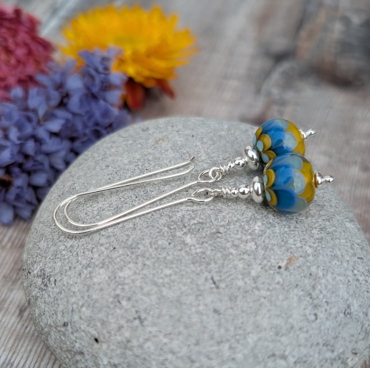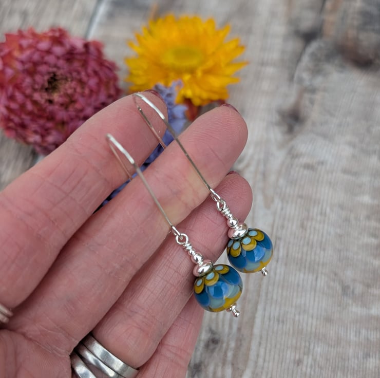 These Silver petals lampwork glass bead earrings feature handmade glass lampwork beads decorated with layered petal designs in shades of blue, pale aqua, and mustard yellow. Each bead is individually made, giving every pair subtle differences that make them unique. The beads hang from long silver ear wires, allowing gentle movement and catching the light as you wear them.