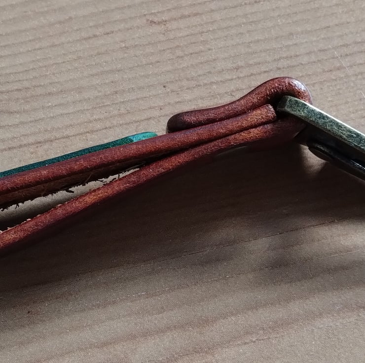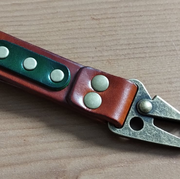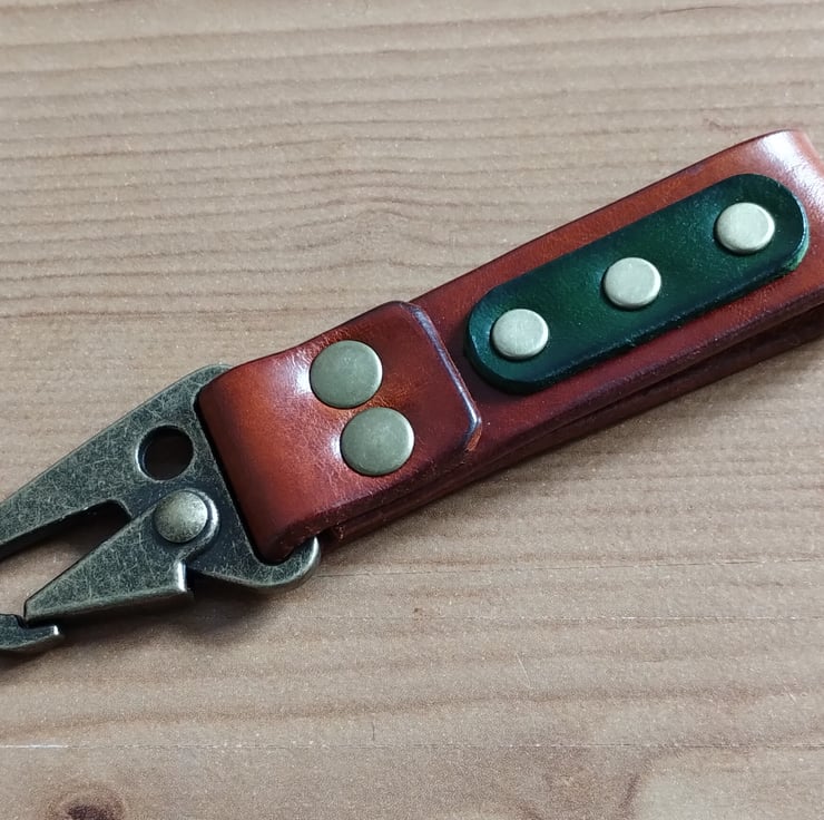 The leather is full grain veg tan, and is 3mm thick. With a metal HK clip, it is a very robust item (especially with the 2 rivets securing the leather). The edges have been bevelled, then burnished with "Tokonole", to leave them smooth and tactile.