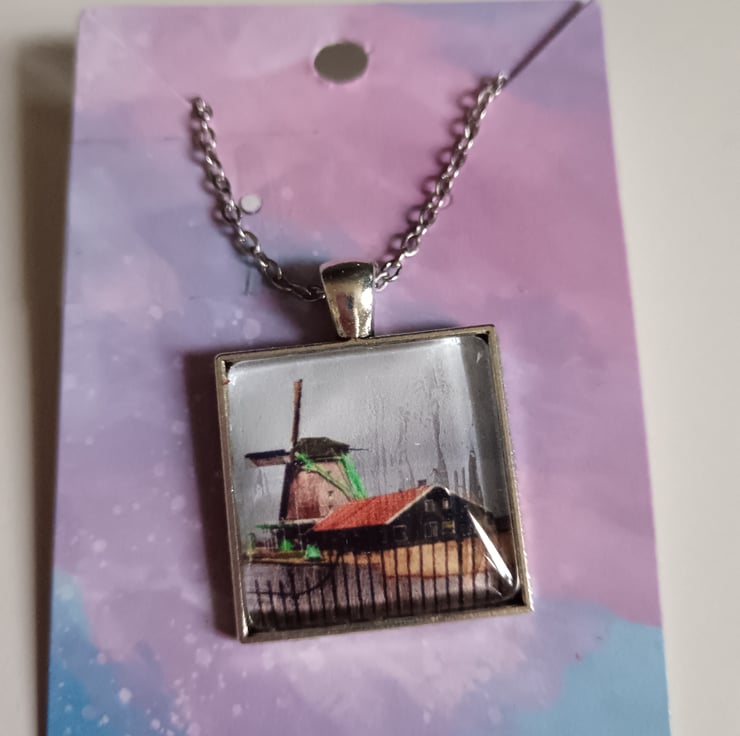 A beautiful handmade souvenir necklace featuring photographs of a windmill in Zaanse Schans, The Netherlands. Placed within a square shaped pendant.