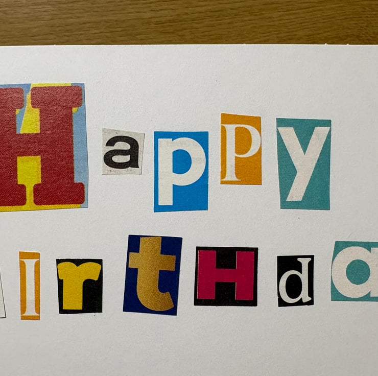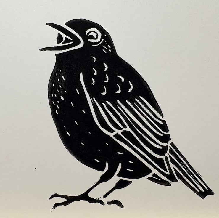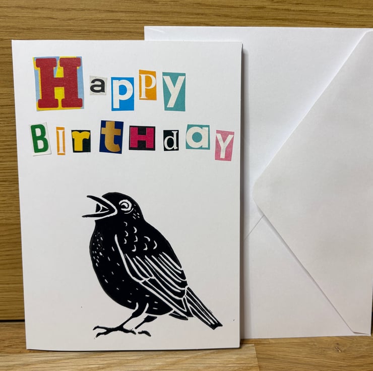 This 100% handmade card features a hand lino-printed blackbird from my own lino-cut stamp, and a unique letter collage for the greeting.