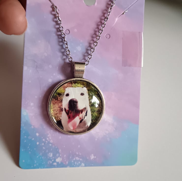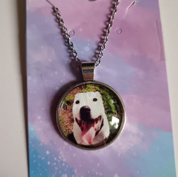 Cute photography necklace featuring a Staffordshire bull terrier dog sticking its tongue out!