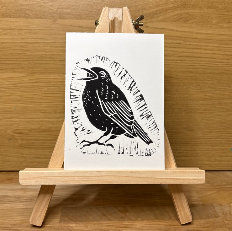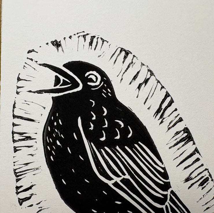 A postcard-sized print of my noisy blackbird lino-cut. I've inked up the background all the way to the edges for this one so he's extra-shouty!
