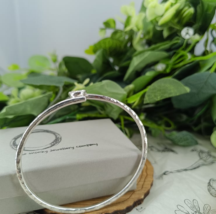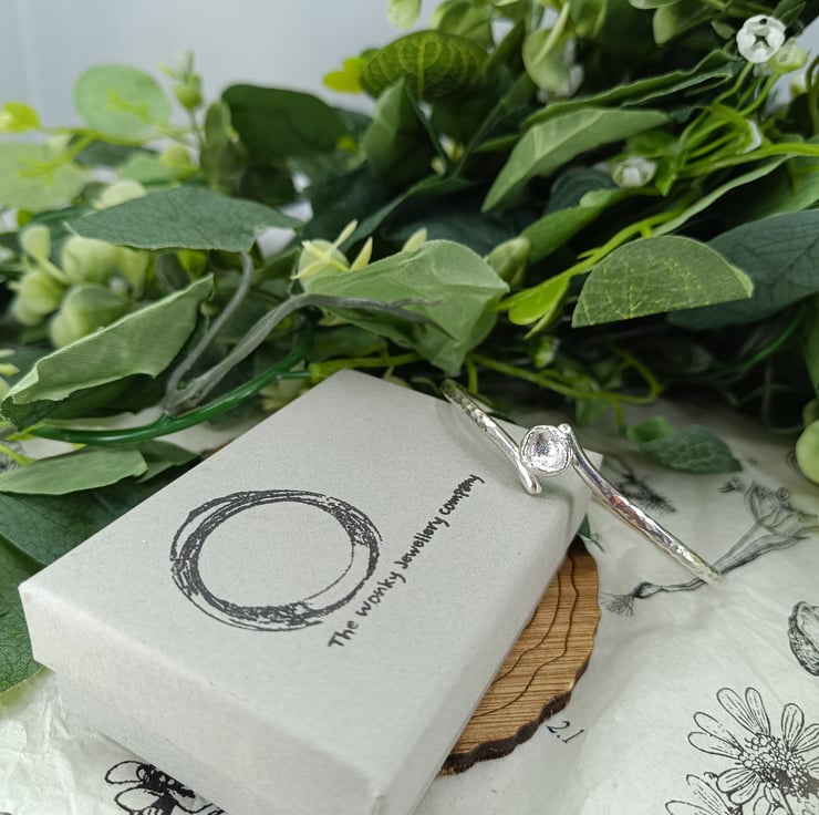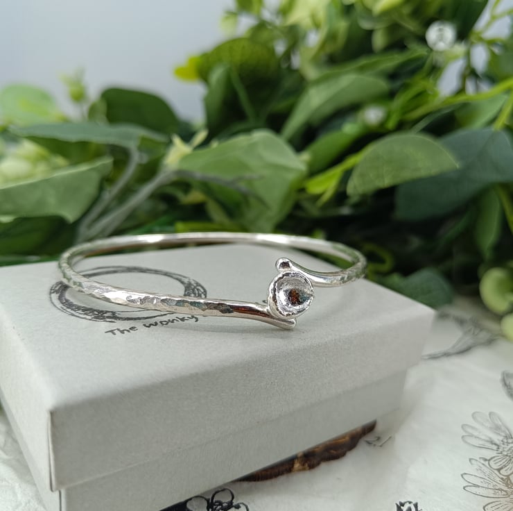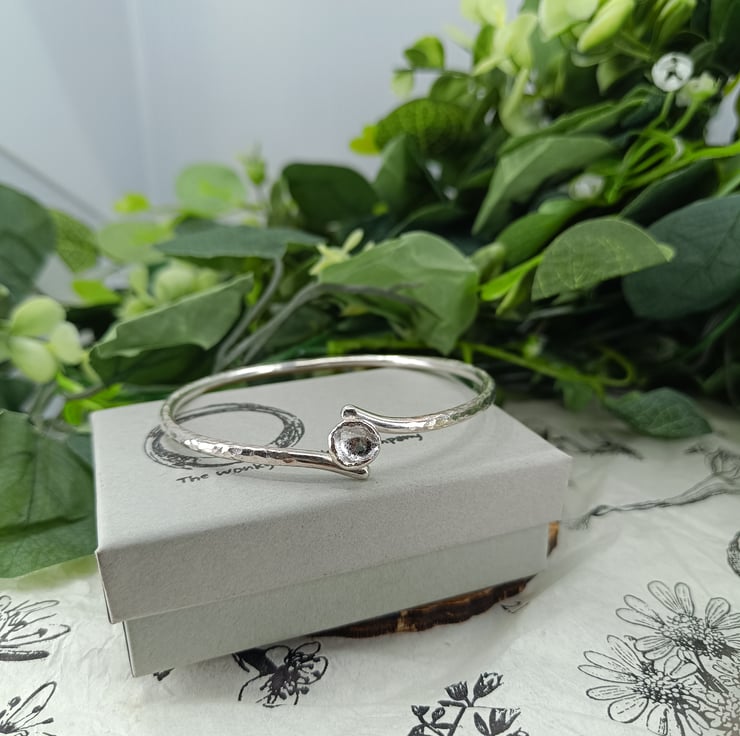 This beautiful and unique bangle is made from sterling silver and is adorned with a 'drop cast' silver grain.
