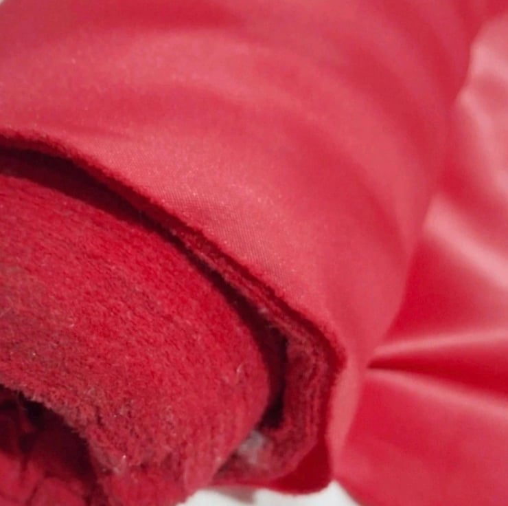 Red polyester duchess satin fabric, cut new from a roll.