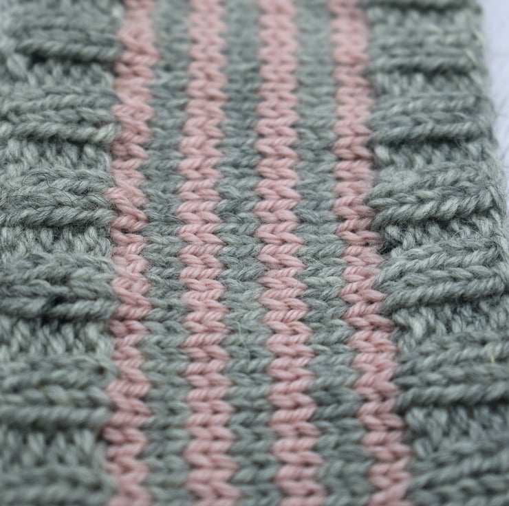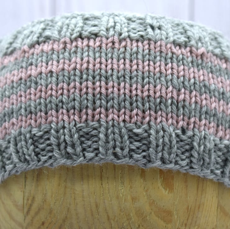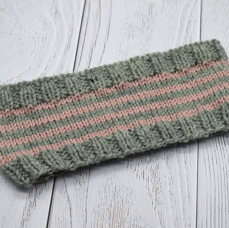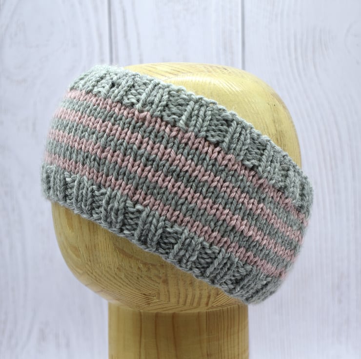 Hand knitted baby headband in soft grey with pale pink stripes. Made using a beautifully soft cashmere and merino blend yarn, this cosy headband is gentle against delicate skin while helping to keep little ears warm.