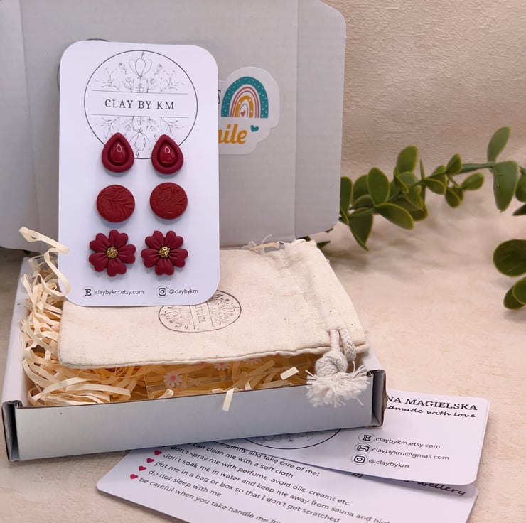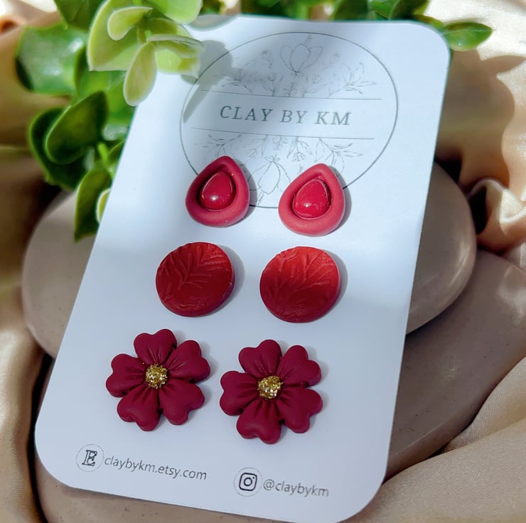 -3 pairs of matching ear studs in one set: teardrop, circle, floral