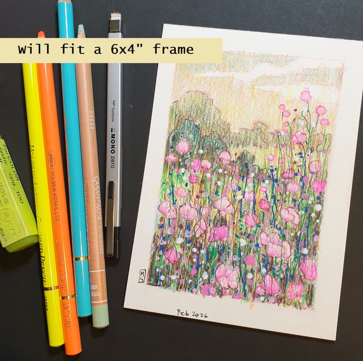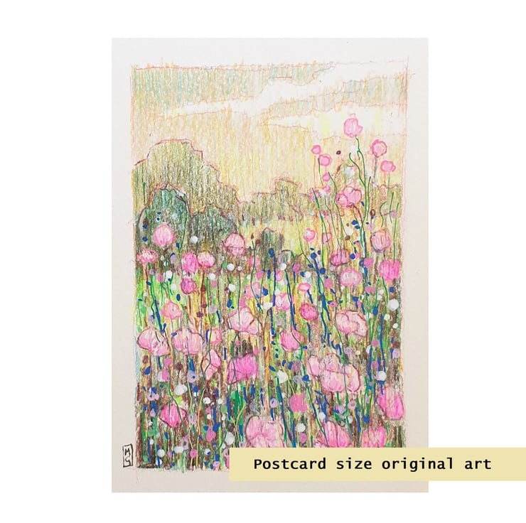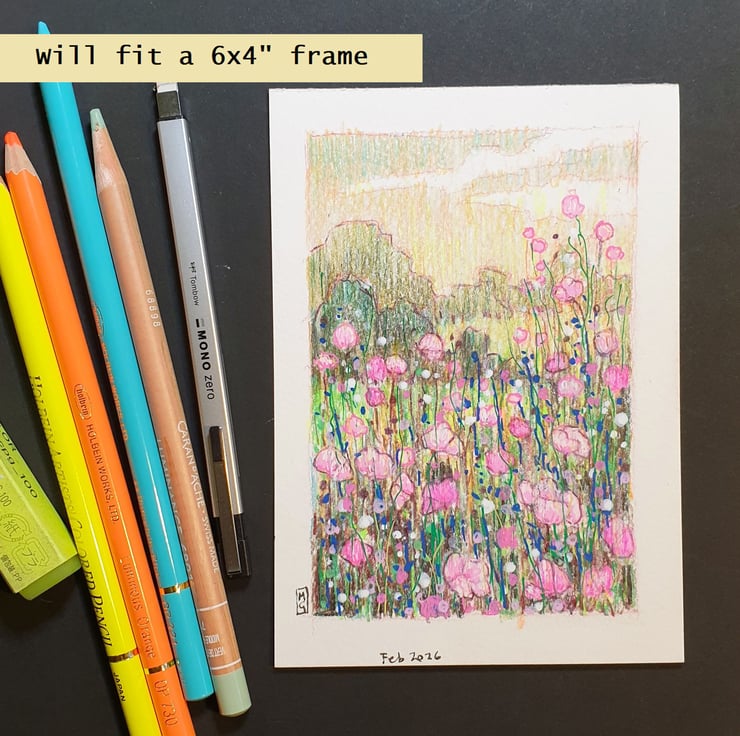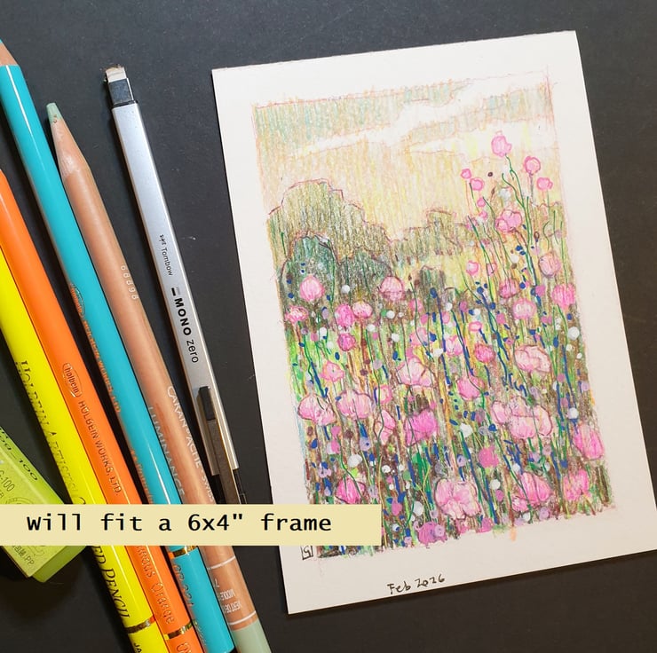 A small drawing in an illustrative style of a flower meadow filled with pink flowers with distant trees.
