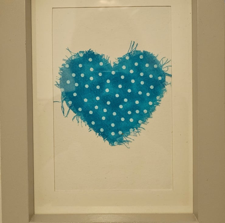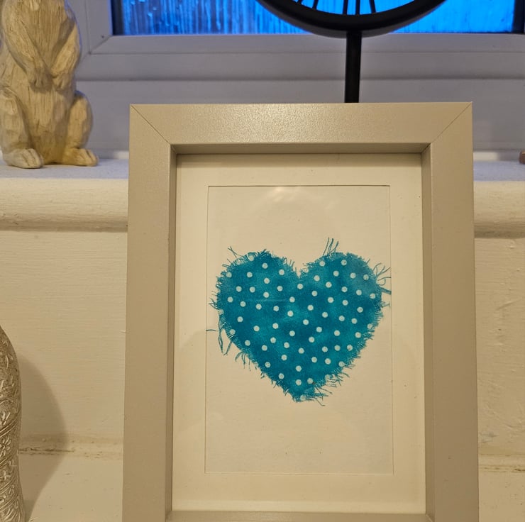 Beautiful sea blue fabric ragged heart with small white polka dots set against a light cream background with grey frame.