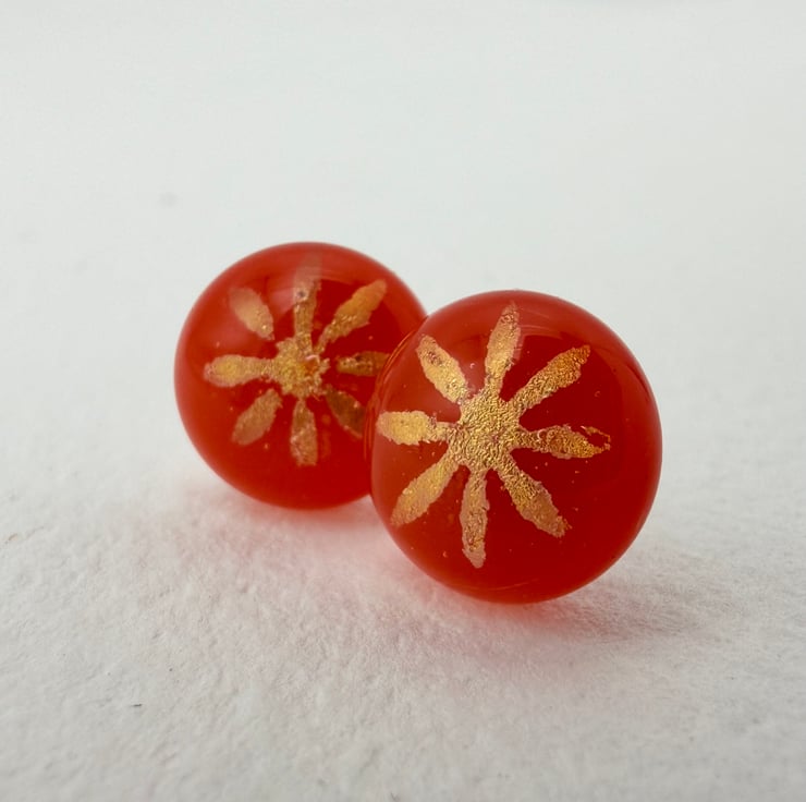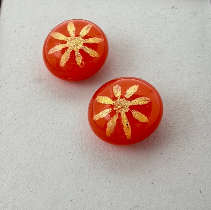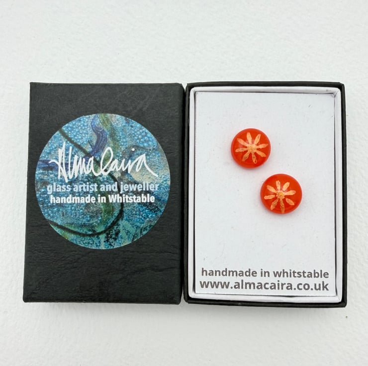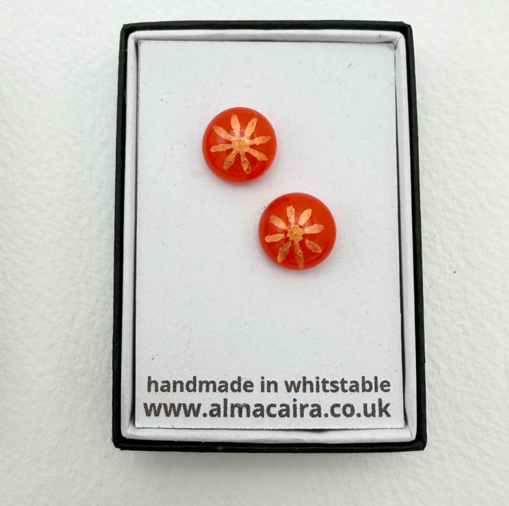 Gorgeous red orange fused glass stud earrings with multicoloured dichroic daisy detail.