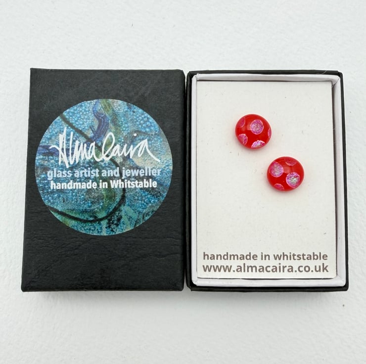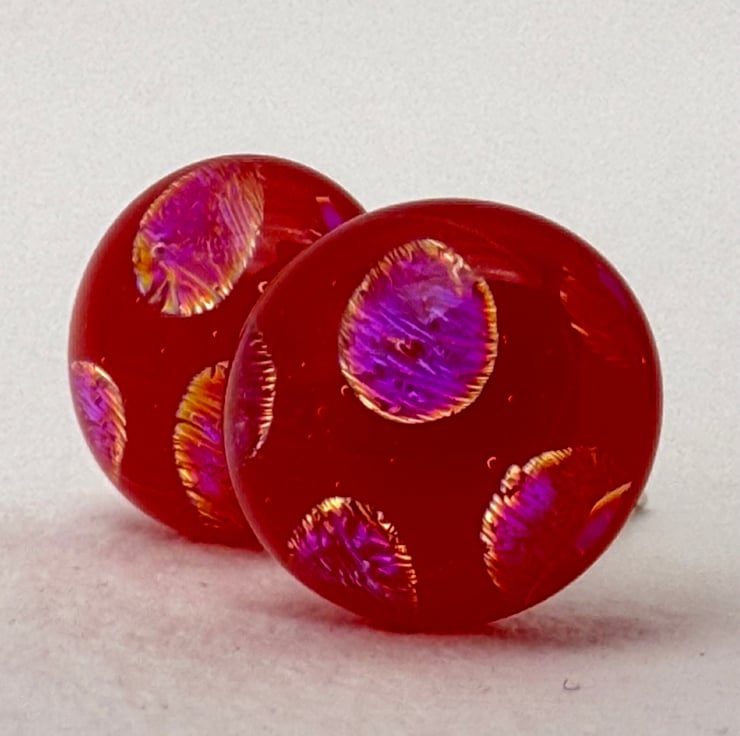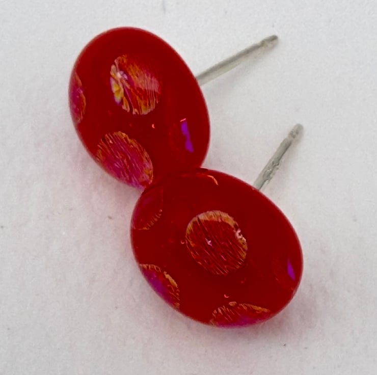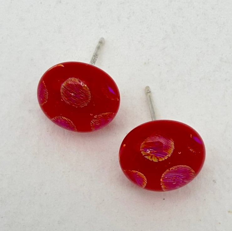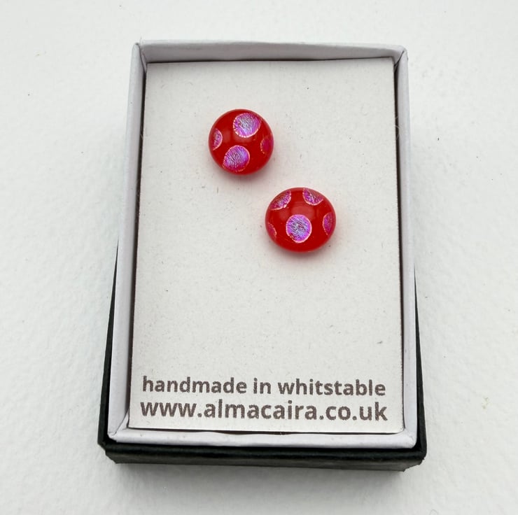 Gorgeous red fused glass stud earrings with dichroic dot detail.