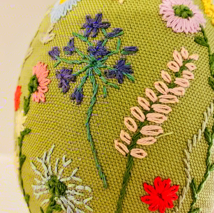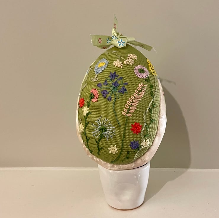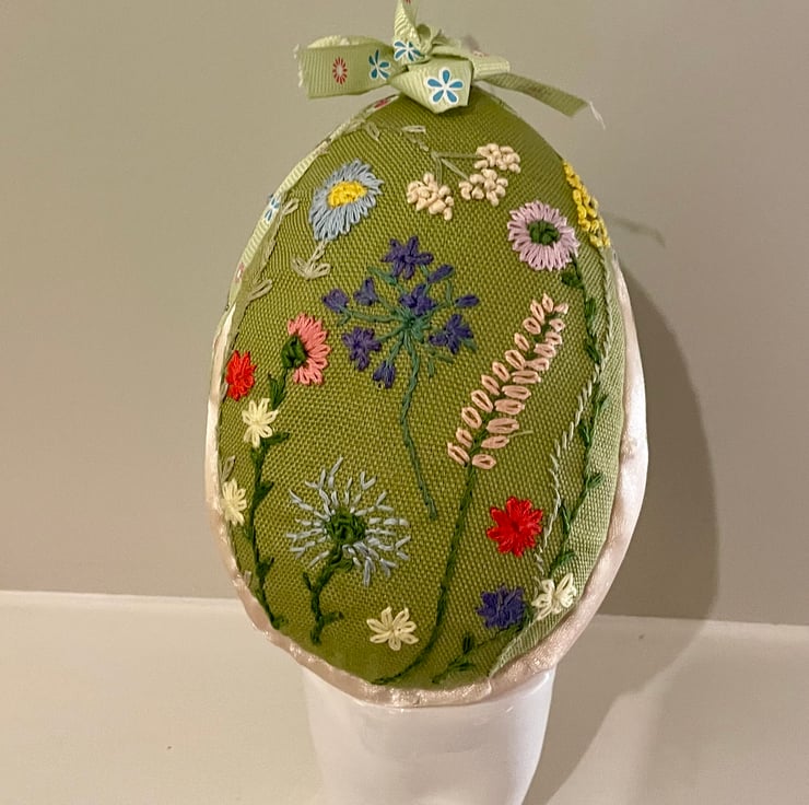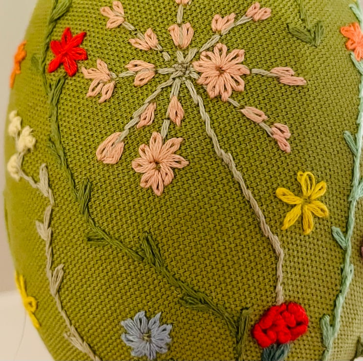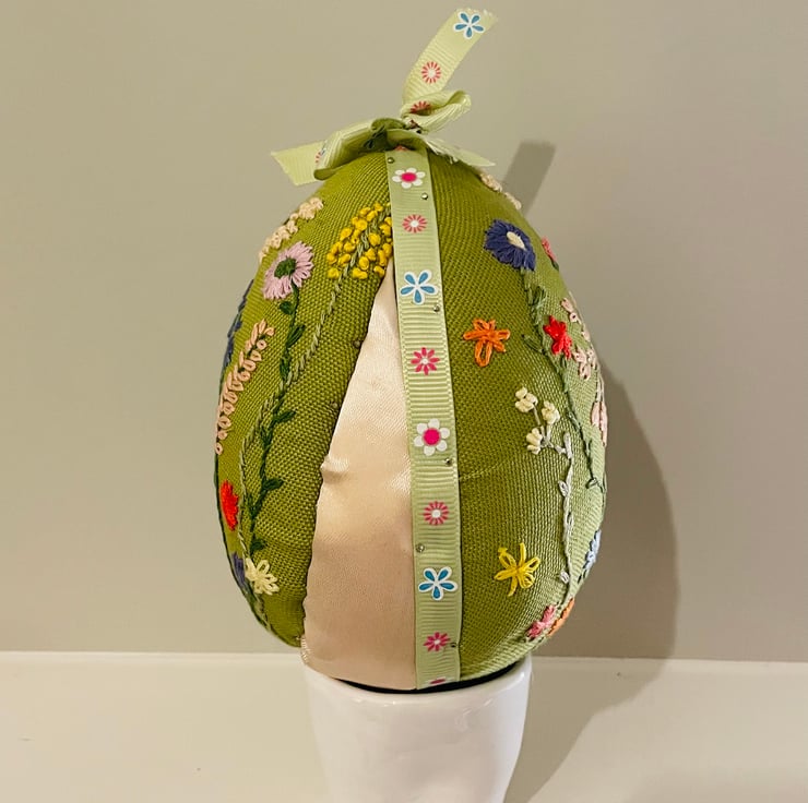 Large Styrofoam egg shape core is covered with a green fabric which is hand embroidered on both sides with summer flowers motif .