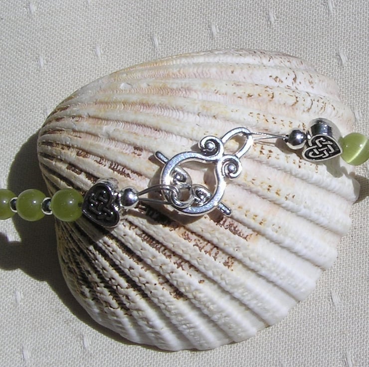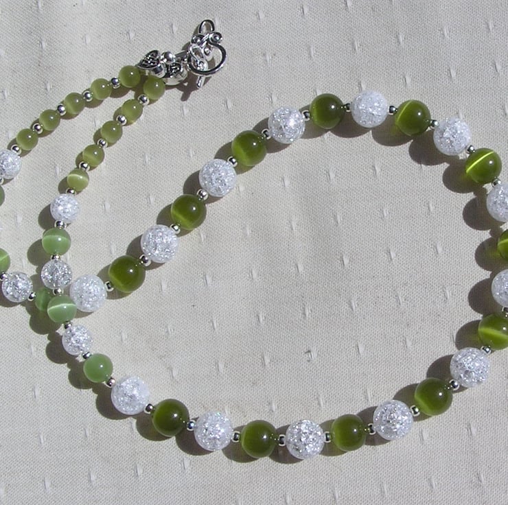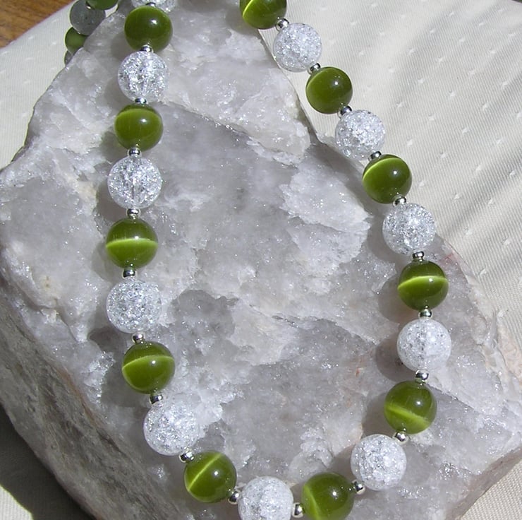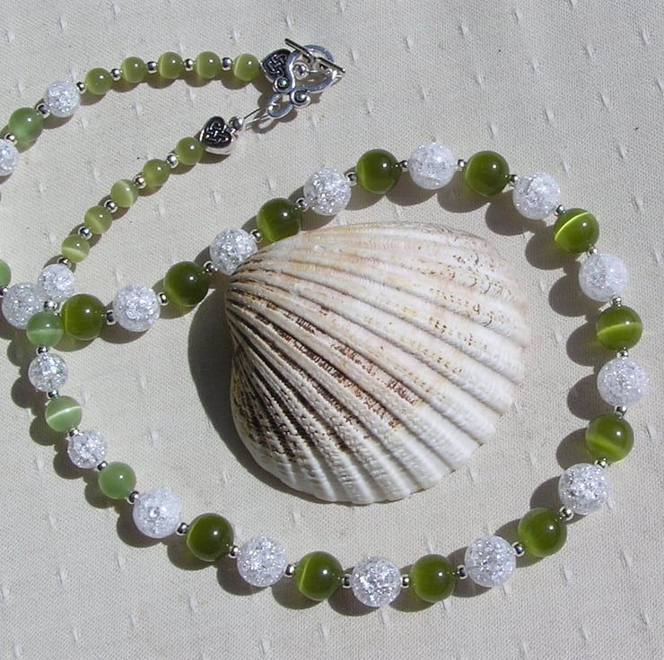 This Stunning Sumptuous Necklace is made from alternating Green Peridot and Crackled Clear Quartz chunky round beads and for that added extra sparkle tiny Silver spacer beads with a small Tibetan Celtic Heart just before the clasp - a Refreshing combination that will look stunning either worn casually or with something more Elegant for a Special Evening out