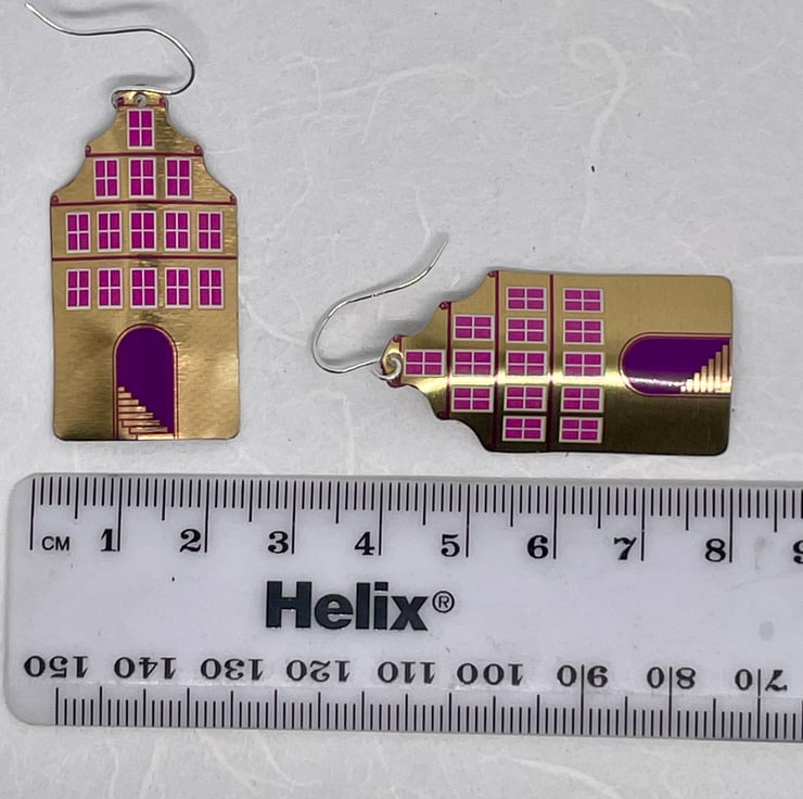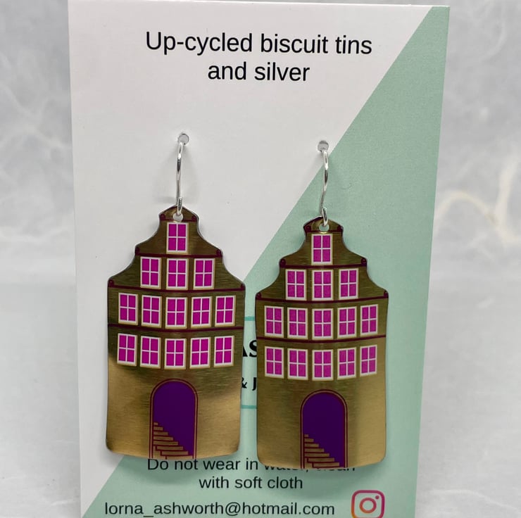 Rather striking house earrings made from a recycled tin. The gold tone of the metal is very shiny and the pink of the windows does pop. They do make quite a statement. I have curved them so that they reflect and look good when worn. These earring measure approximately 2.cm wide and 5cm in length. Supplied on a card in an organza bag.