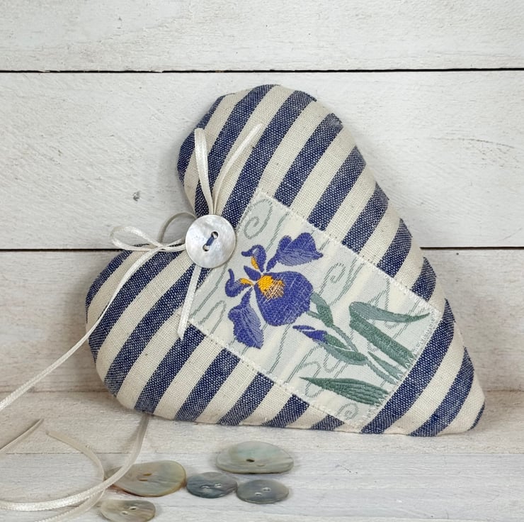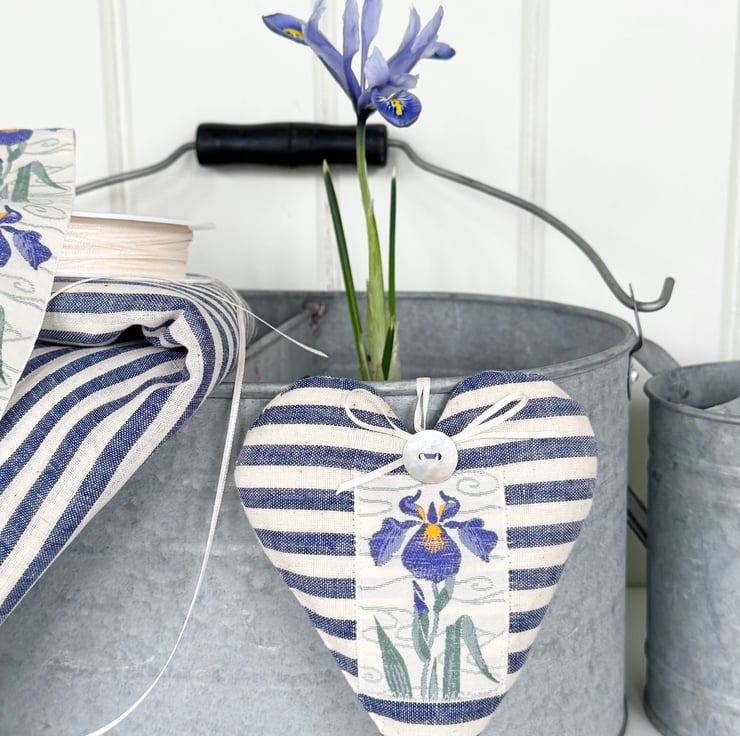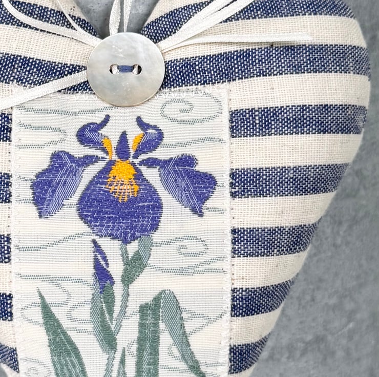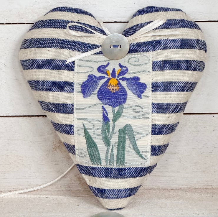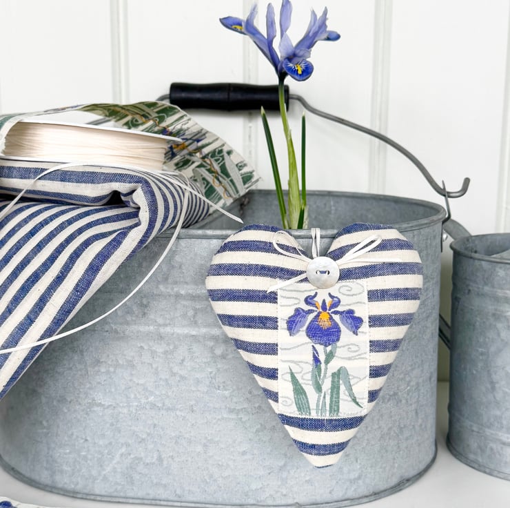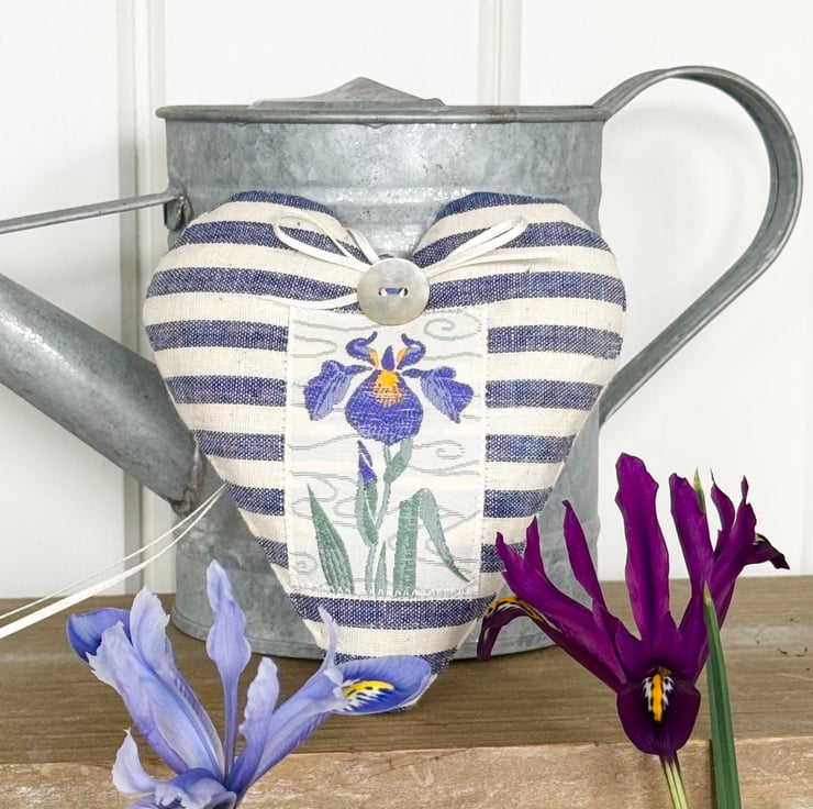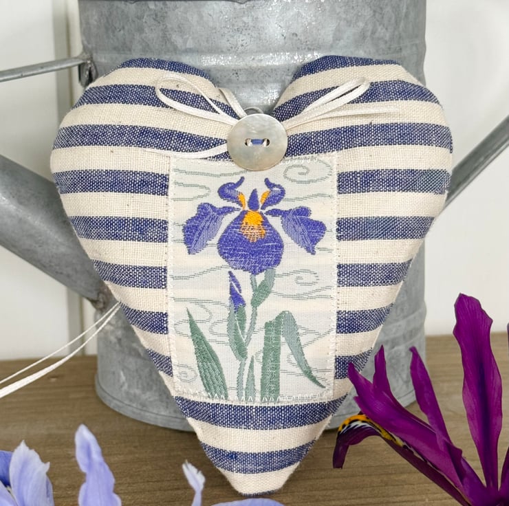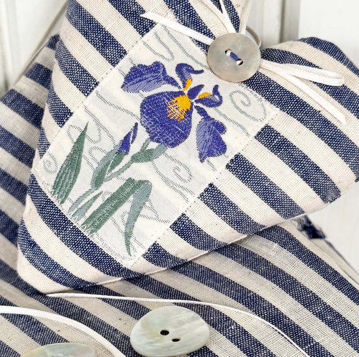 The third in the series - the Heart of the Month for March - is in beautifully textured indigo and white striped French cotton, with an exquisite violet-hued iris on the front. Firmly packed with gloriously fragrant lavender (or with hypoallergenic wool toy stuffing), and finished with an iridescent mother-of-pearl round button, and with ivory ribbon hanging ties and bow, and with a cotton 'heatherandhome' label on the reverse side.