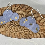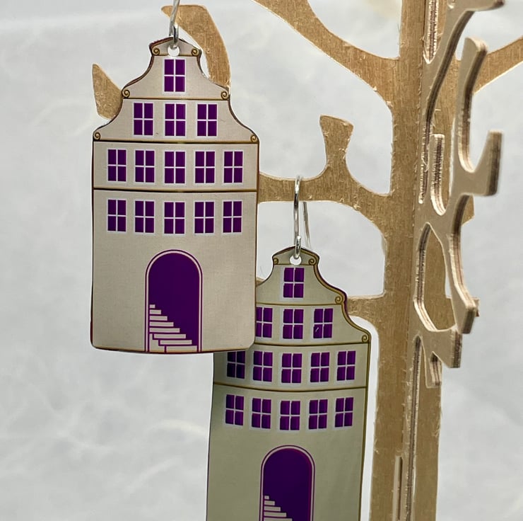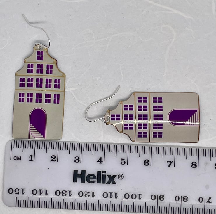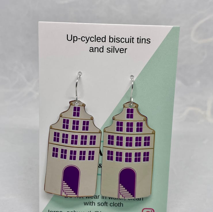 Lovely white and purple fairly large house earrings made from a recycled tin. They are lightweight earrings that really get noticed. The earrings are curved so that they hand well and don’t look flat.