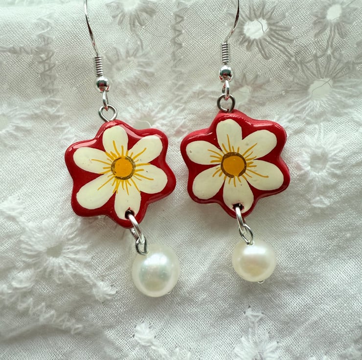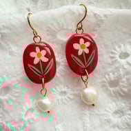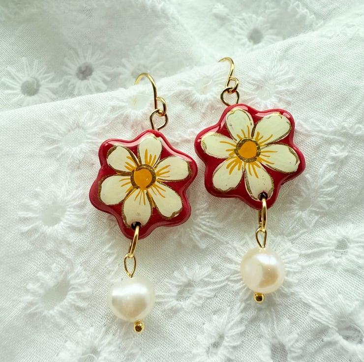 Romantic statement earrings featuring hand-painted Cream florals with delicate Gold detailing, paired with a pearl drop charm. Finished with Gold plated hooks, these earrings feel elegant, feminine, and perfect for special moments.