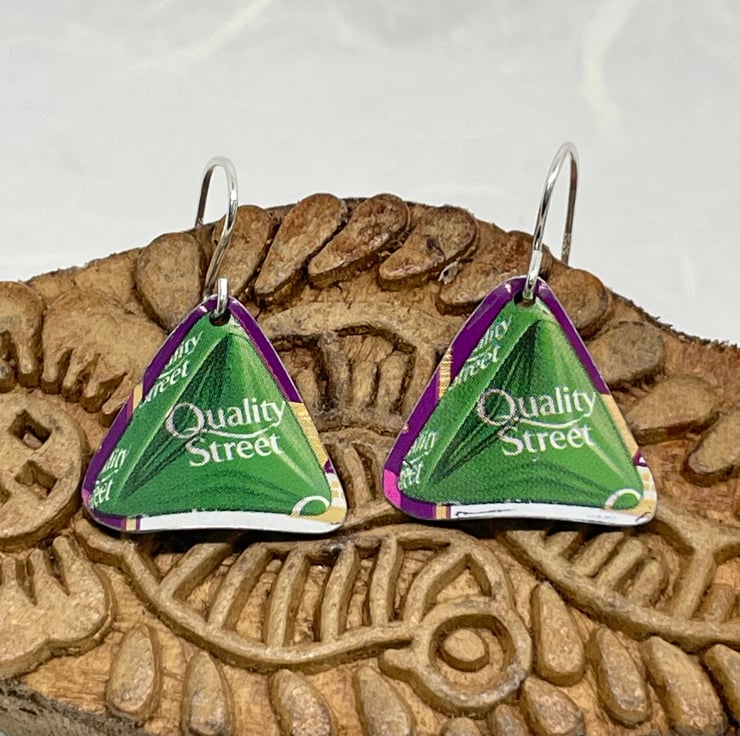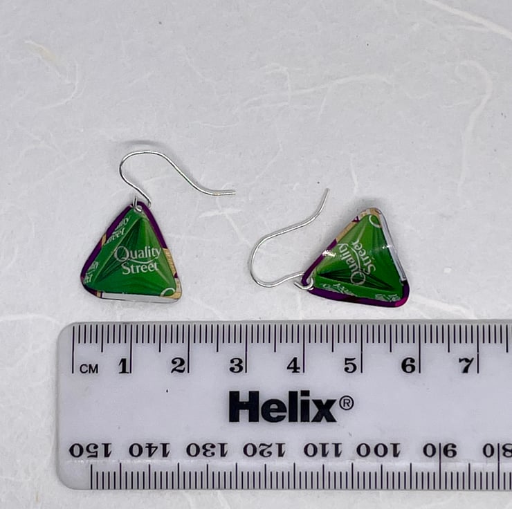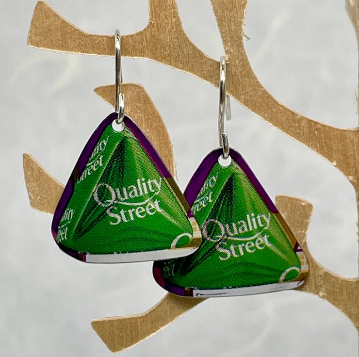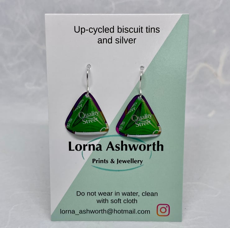 Oh The Green Triangle, who spends time rummaging through the tin to see if any of these are left! These earrings are made from recycled Quality Street Tins, one pair only (to be honest I don’t usually accept these tins but this year I have). These earrings have a gentle curve so that they hang nicely when worn.