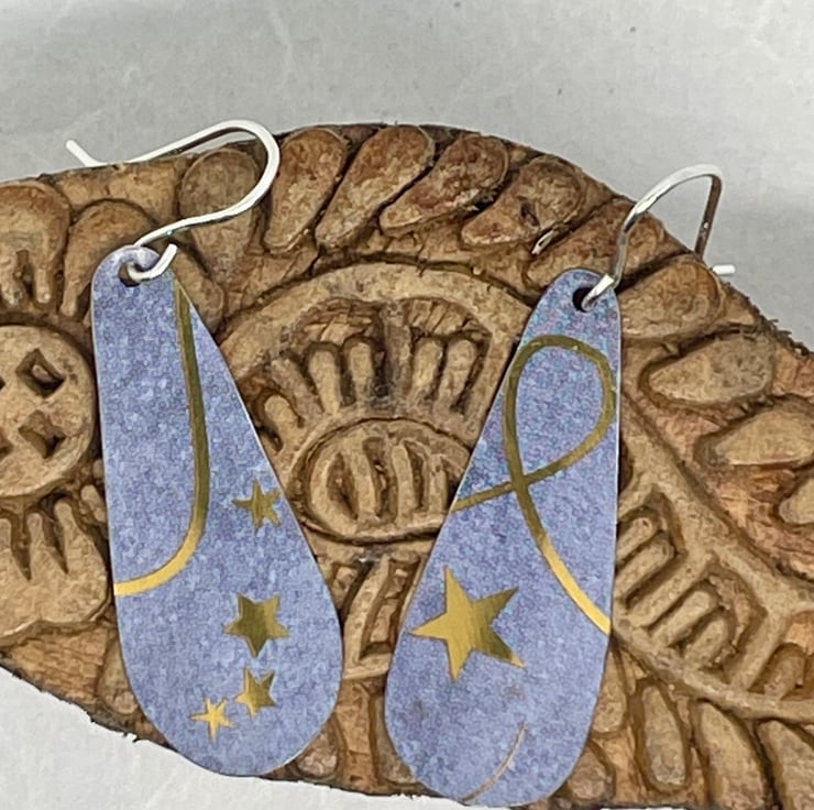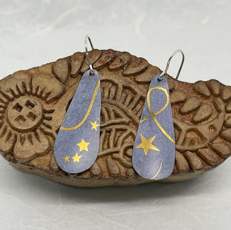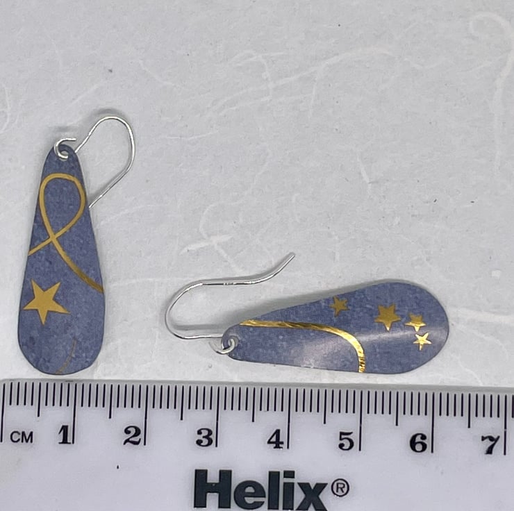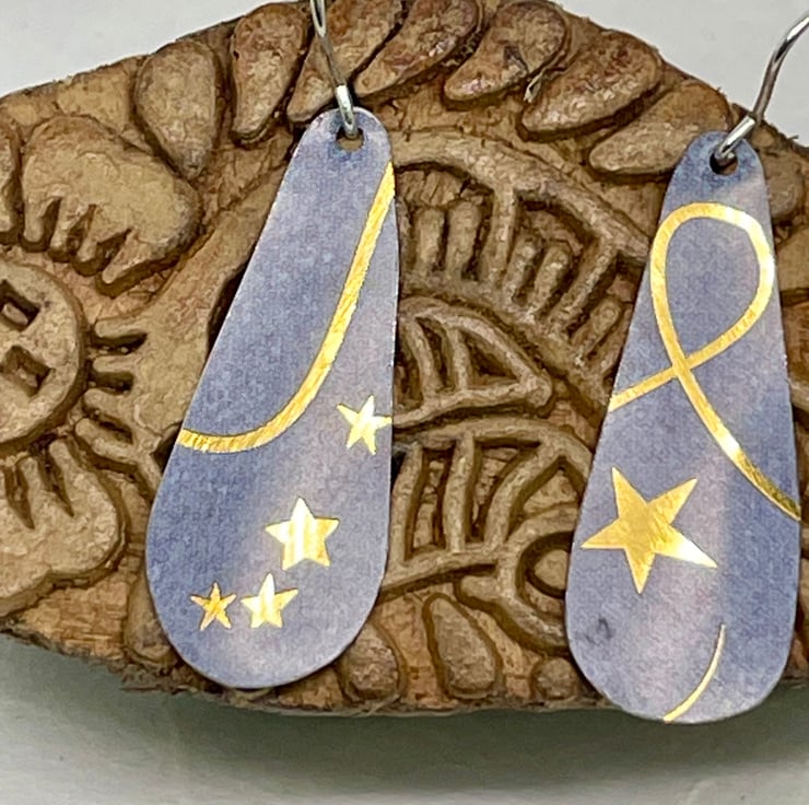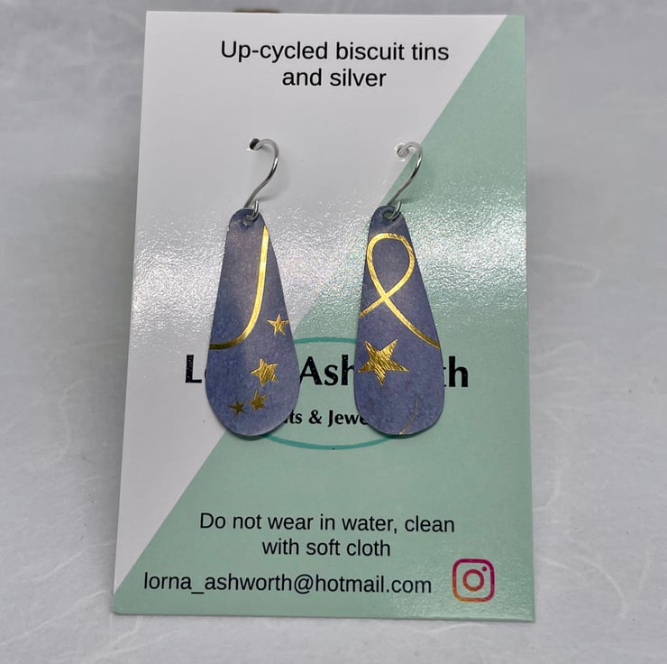 Dainty asymmetric earrings made from a recycled biscuit tin. Lovely mottled light denim blue background with very shiny gold stars, due to the irregular pattern on the tin each one is different. Very lightweight and easy to wear with a gentle curve.