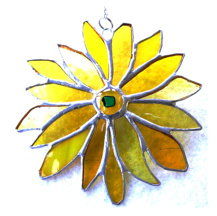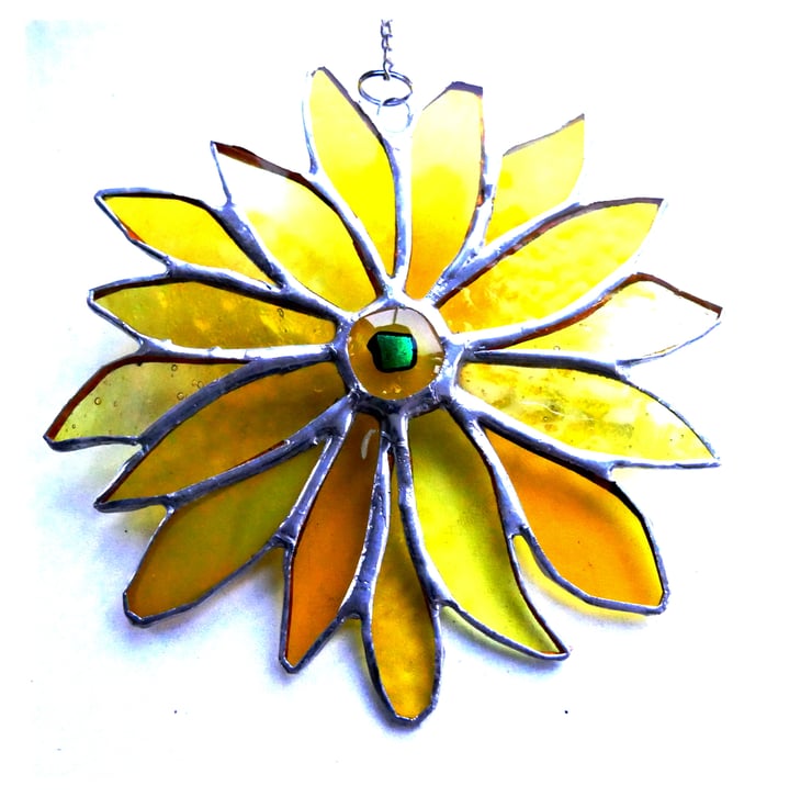 The flower has 16 petals, all slightly different shapes and types of glass. In the centre is a special yellow glass nugget with a dichroic topping which I fused in my kiln.