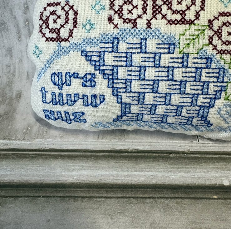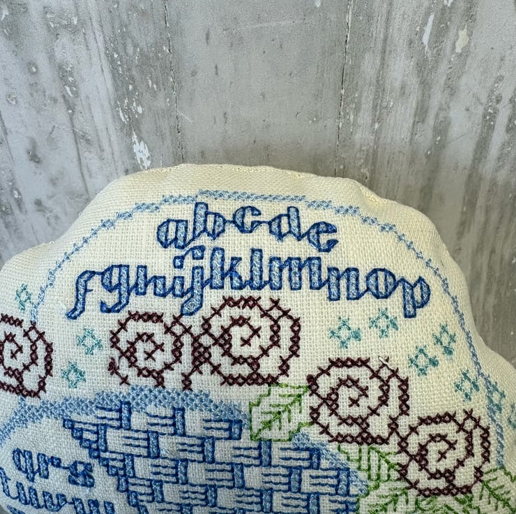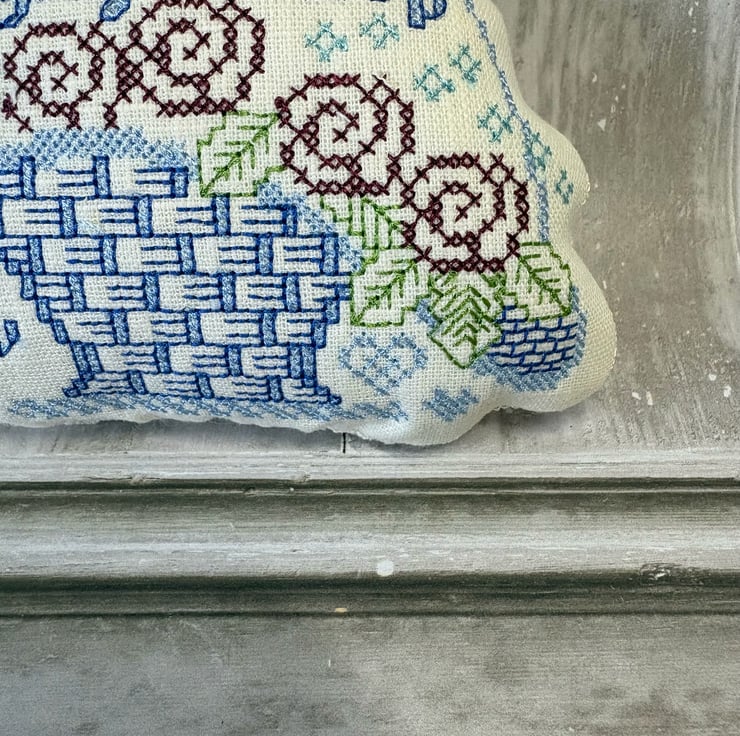 Bowl Filler machine embroidered cross stitch design. Measuring 5.25" x 3.75". Perfectly Pale prewashed linen fabric filled with polyester fibrefill. Little pillows of fun. Select 1 or fill a bowl full of Spring colours.