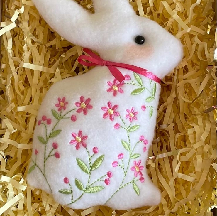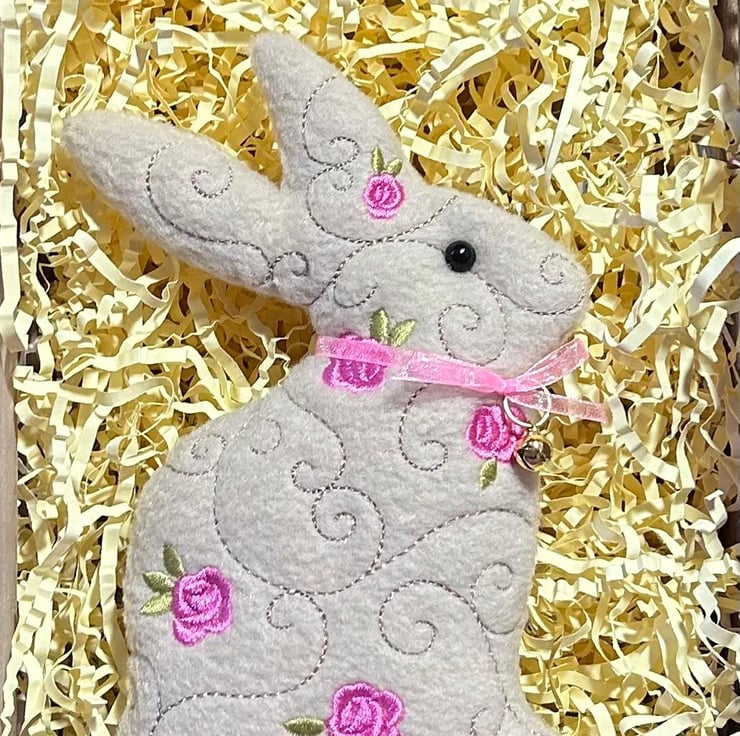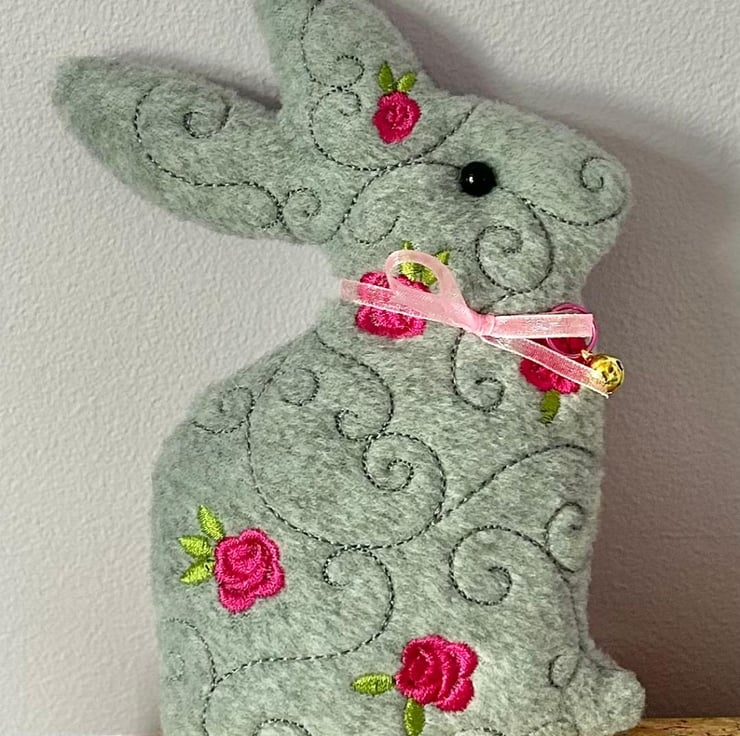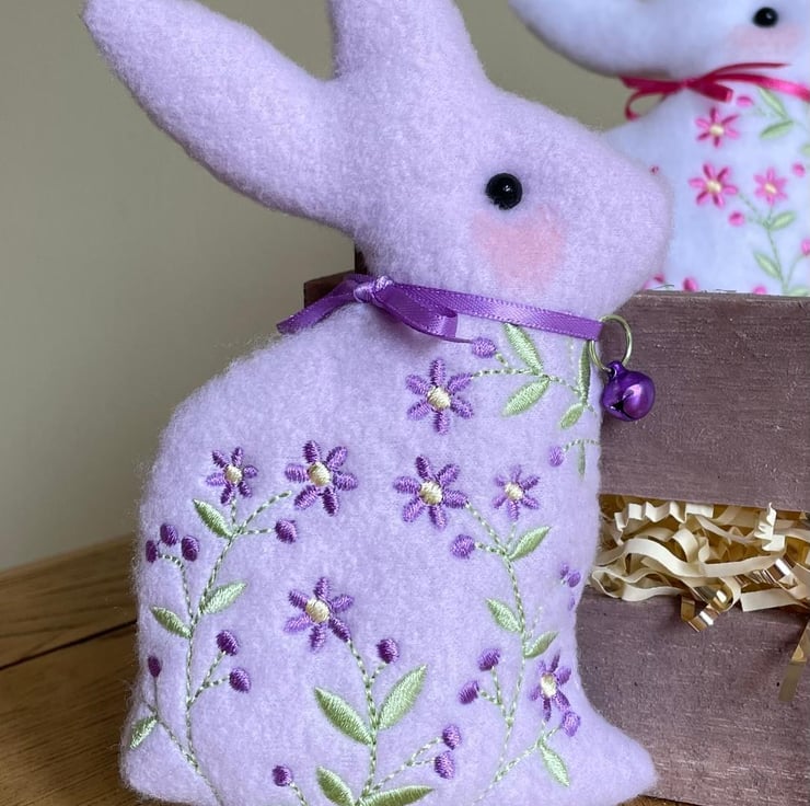 Easter bunny handmade from soft fleece with delicately embroidered details. Lightly stuffed and finished off with a colour coordinated bow and small jingle bell.