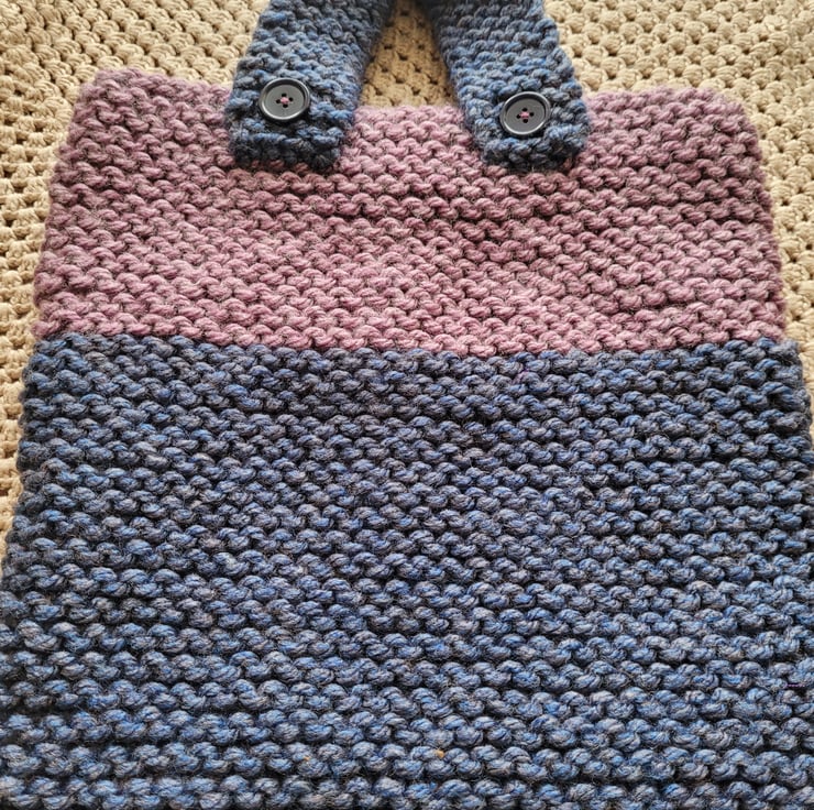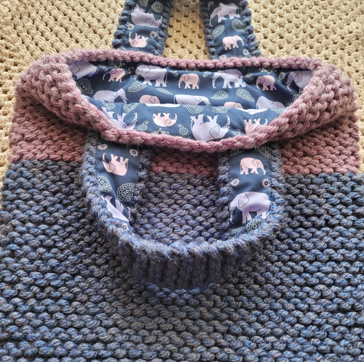 Hand knitted in blue a.d purple yarn. Lined with a matching elephant print fabric. Depth 14 inches. Width 13 inches. Hand wash, dry flat.