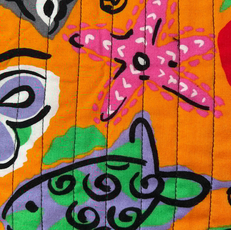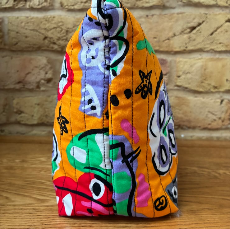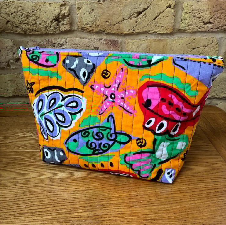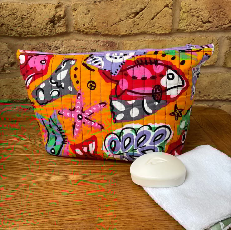 The quilted wash bag is made in this bright under the sea print featuring fish, starfish and seaweed on an orange background.