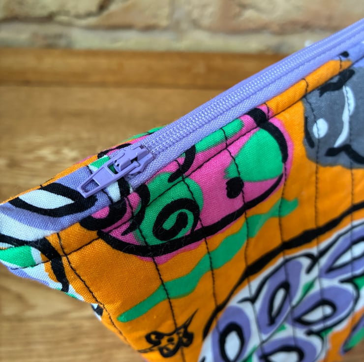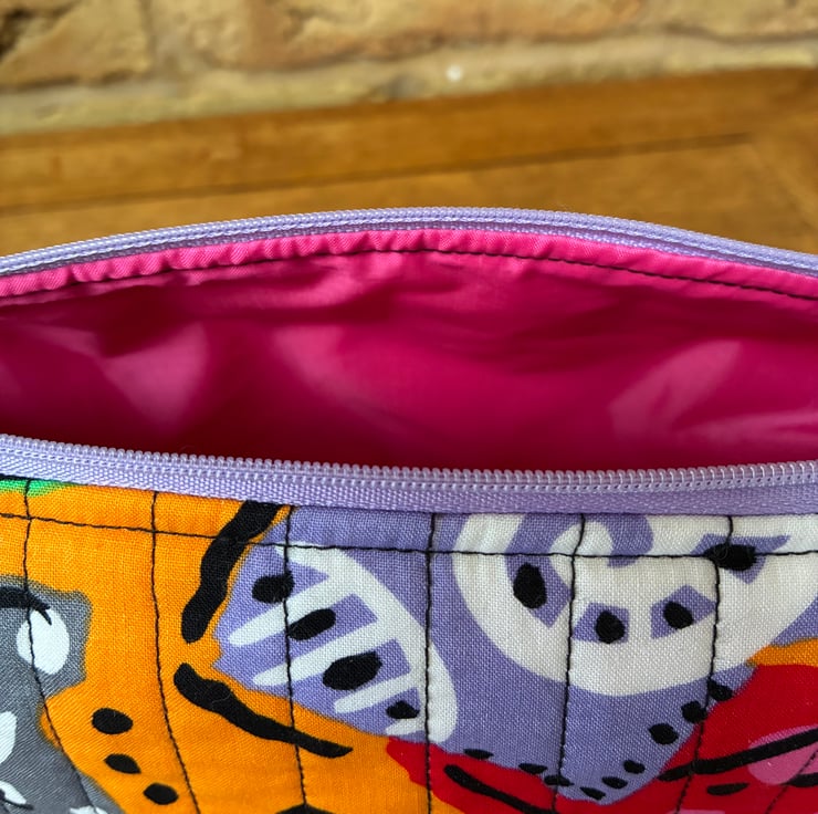 The bag is quilted with black stitching and the lilac zip is finished with tab ends.