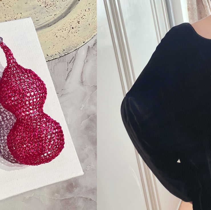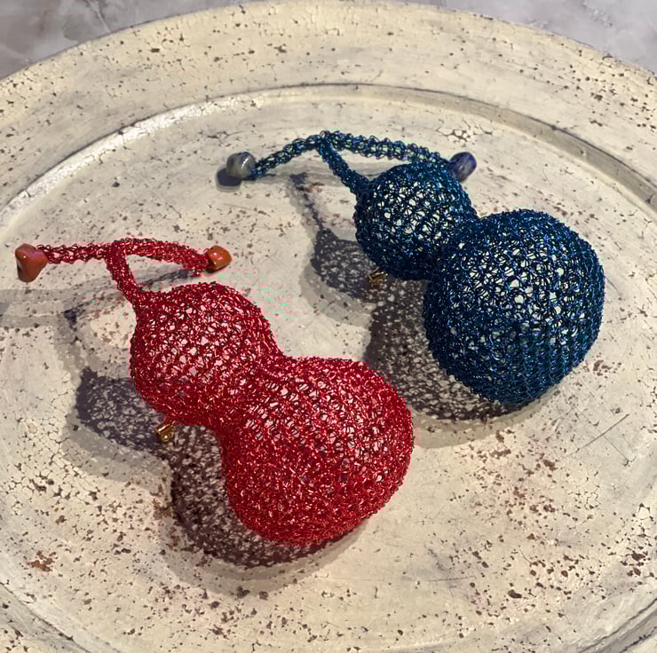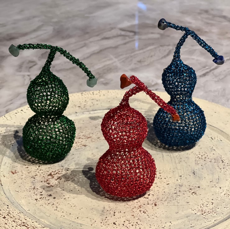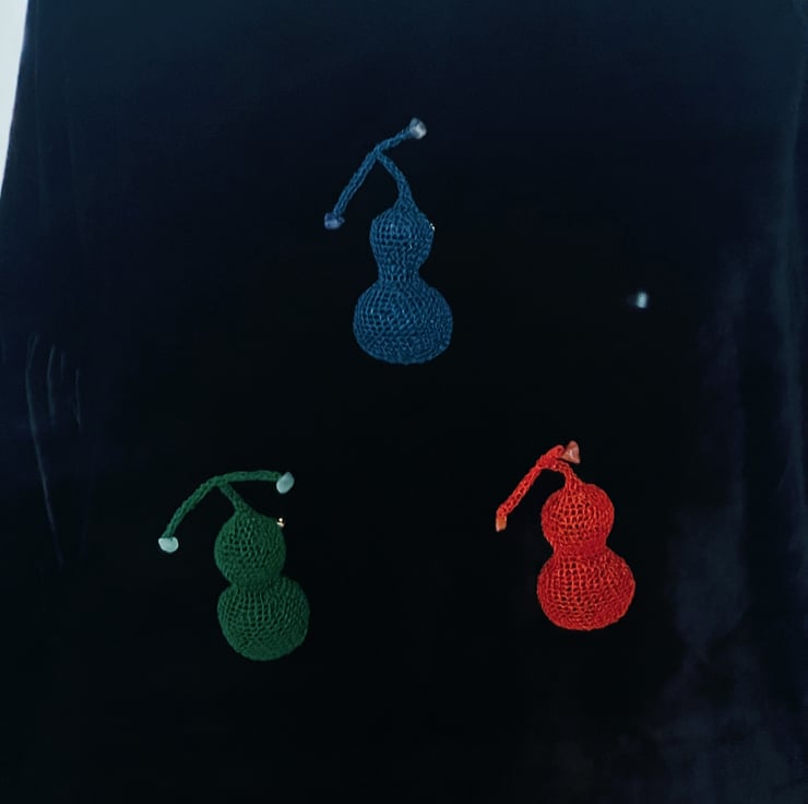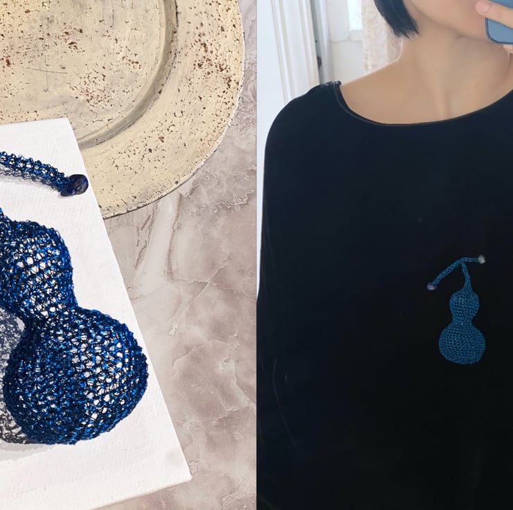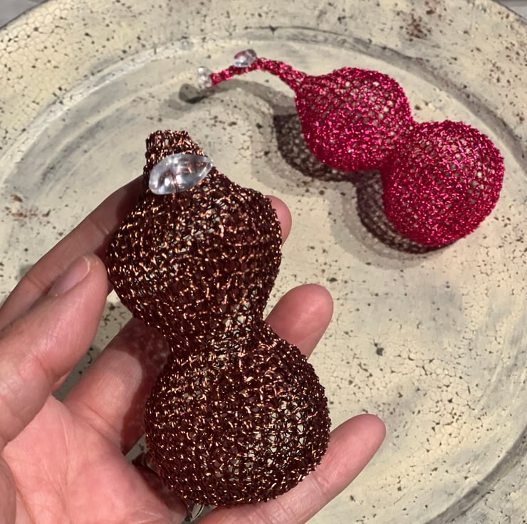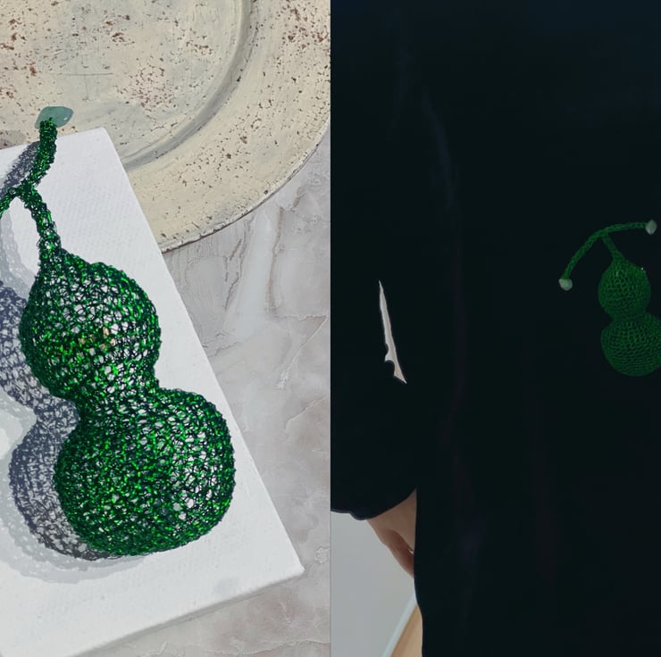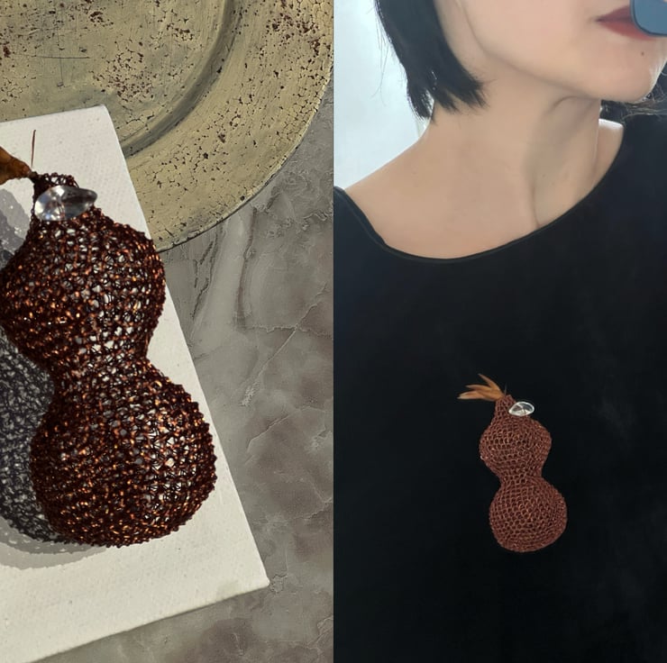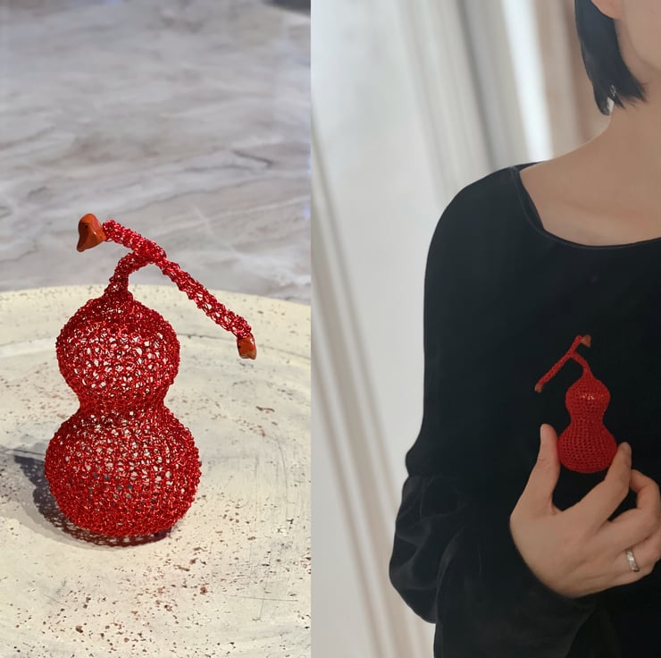 The inspiration for this brooch comes from the calabash, a symbol of fortune and prosperity (Fu Lu) in Chinese culture. Its form is pleasantly plump and distinctive. Each individual calabash is crafted through about 8 hours of meticulous crochet weaving, using a single, continuous 40-meter strand of colored copper wire.